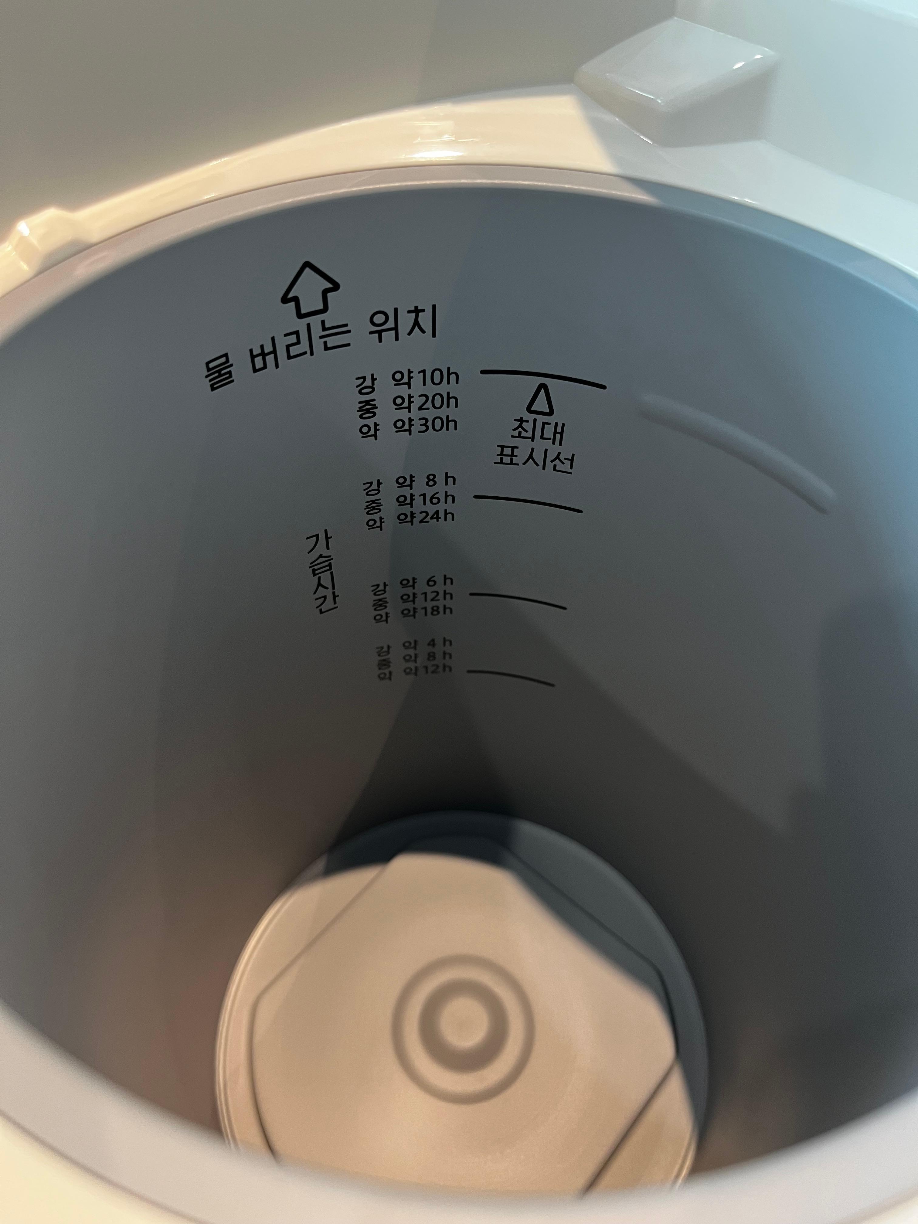 내부 용기 안에는 물의 용량별, 가습 세기별 사용가능 시간이 표시되어 있다.