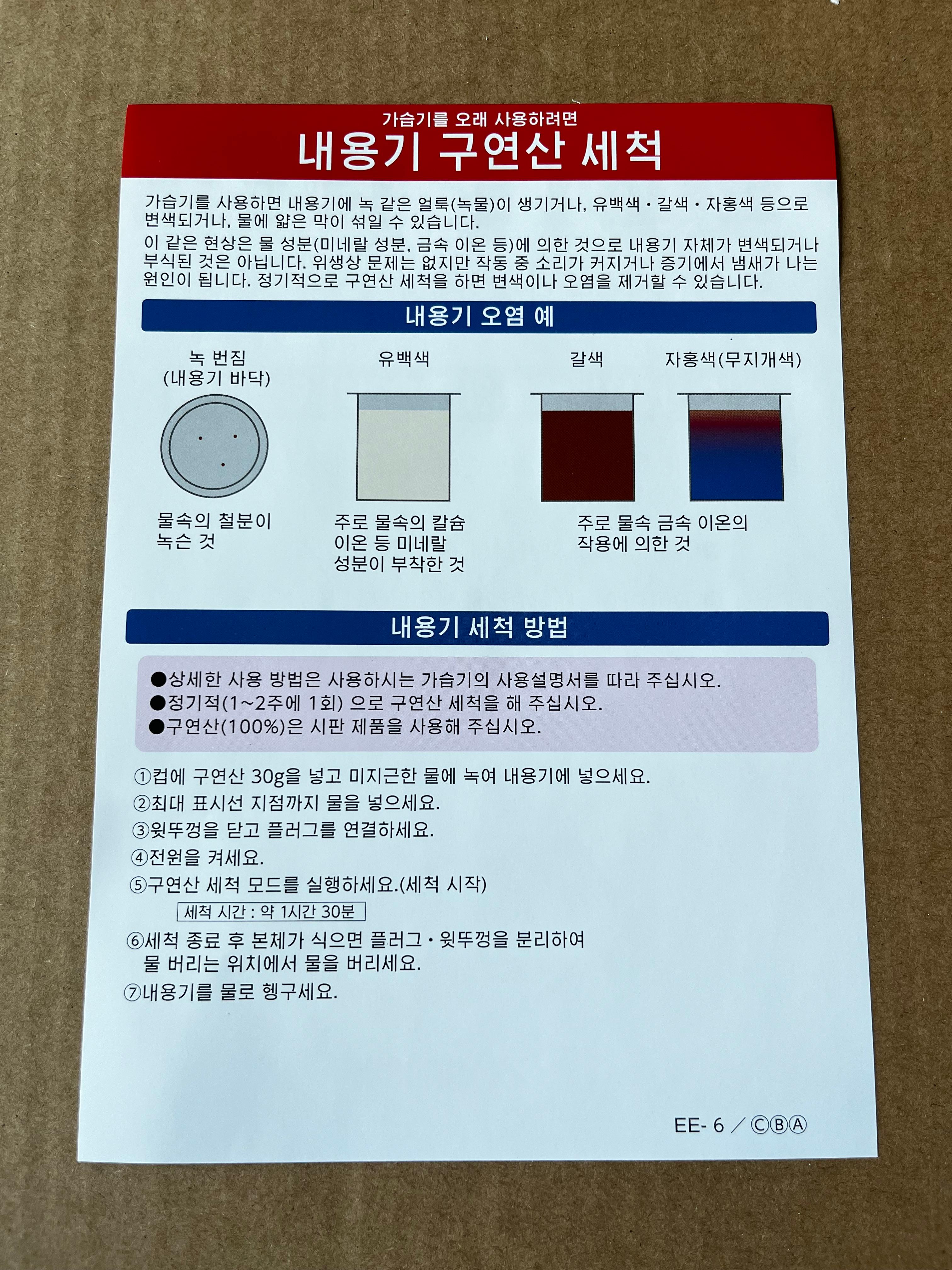 공기에 직접 퍼져 가습 하는 제품이니 강한 세제를 쓰는 건 안될 일인 것 같다.