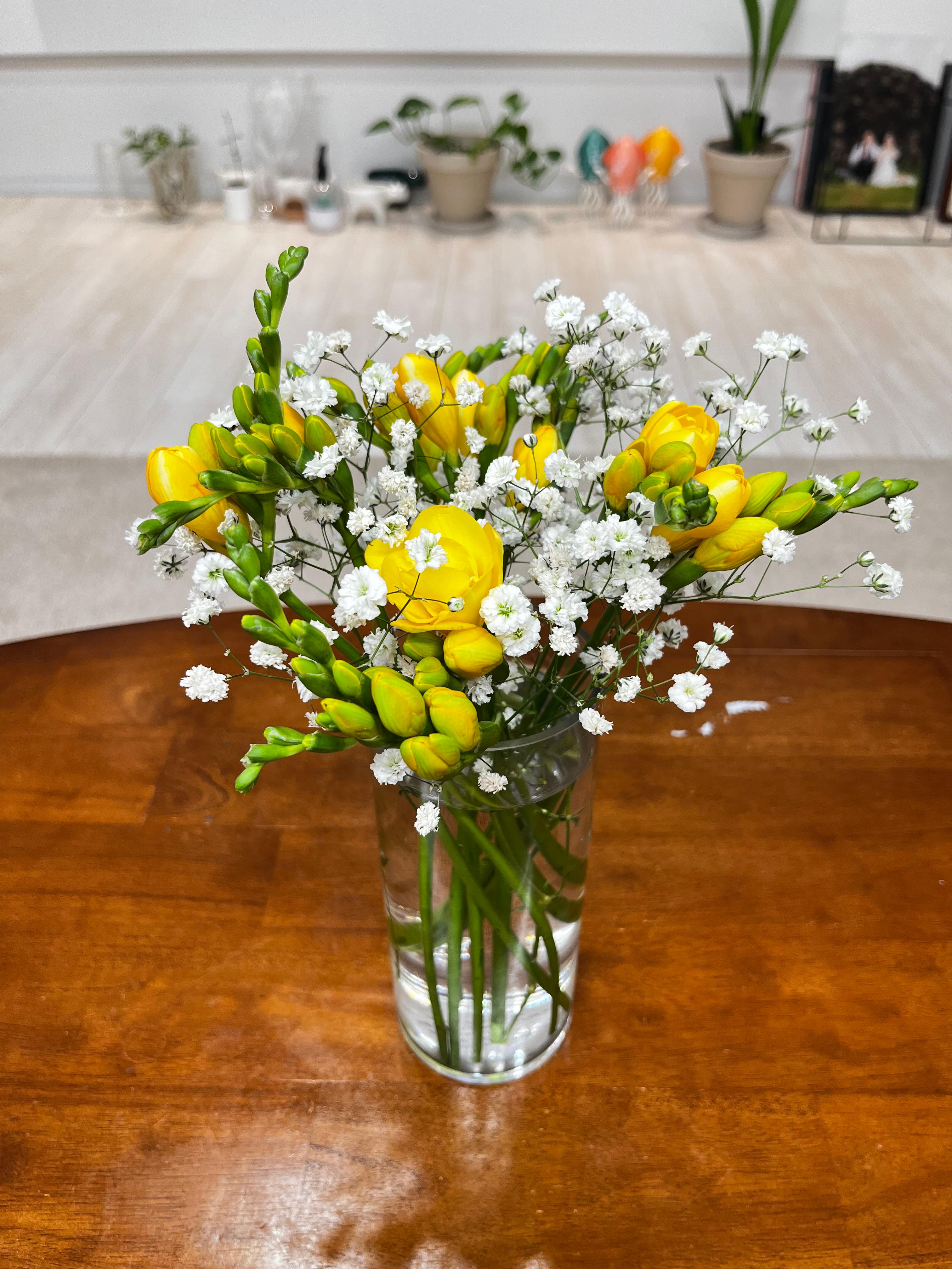 봄을 알리는 듯 노랗게 피어난 프리지아와 하얀 안개꽃.