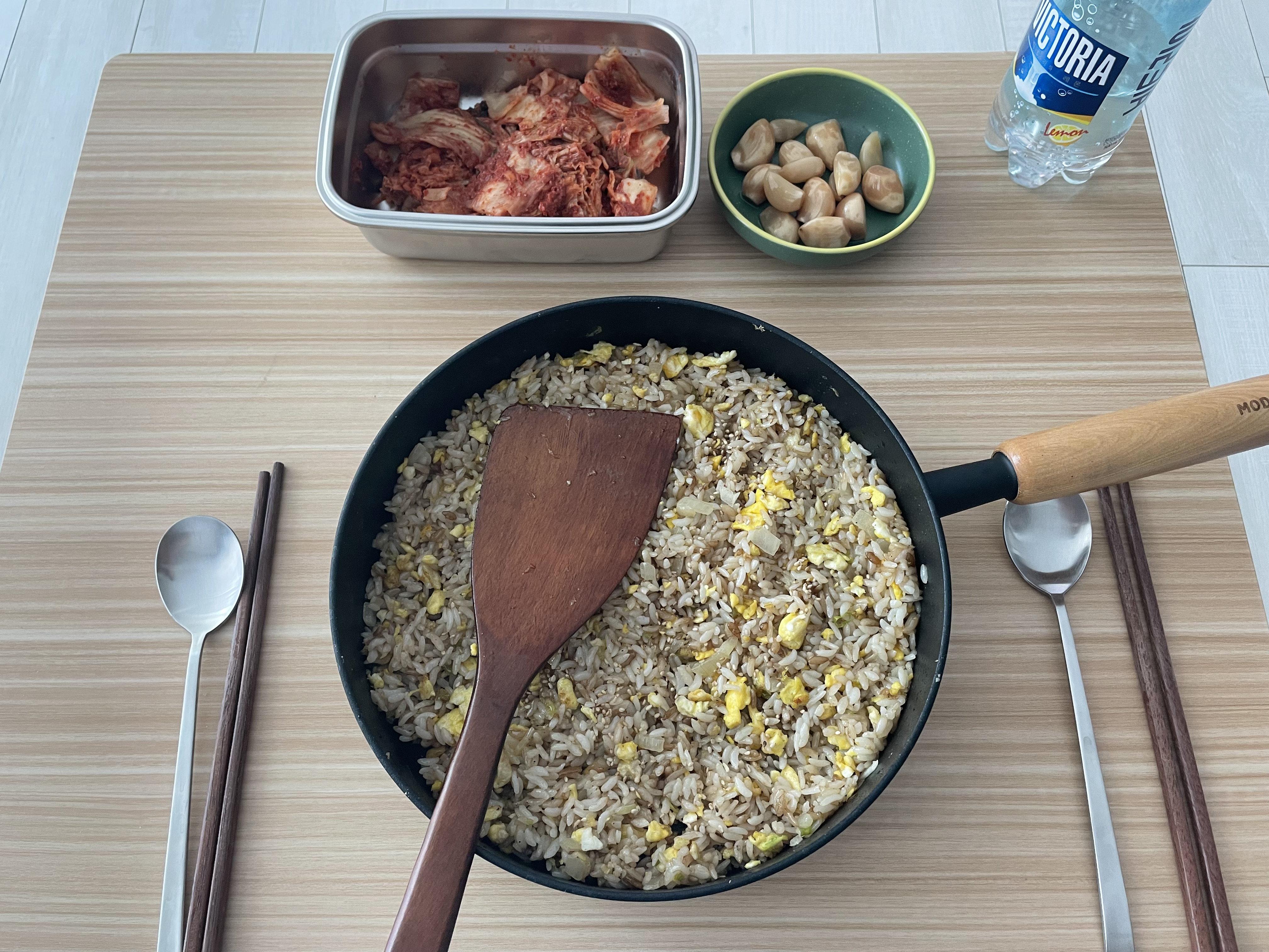 따뜻하고 고소한 밥에 김치랑 장아찌 한 조각 올려서 먹는다.