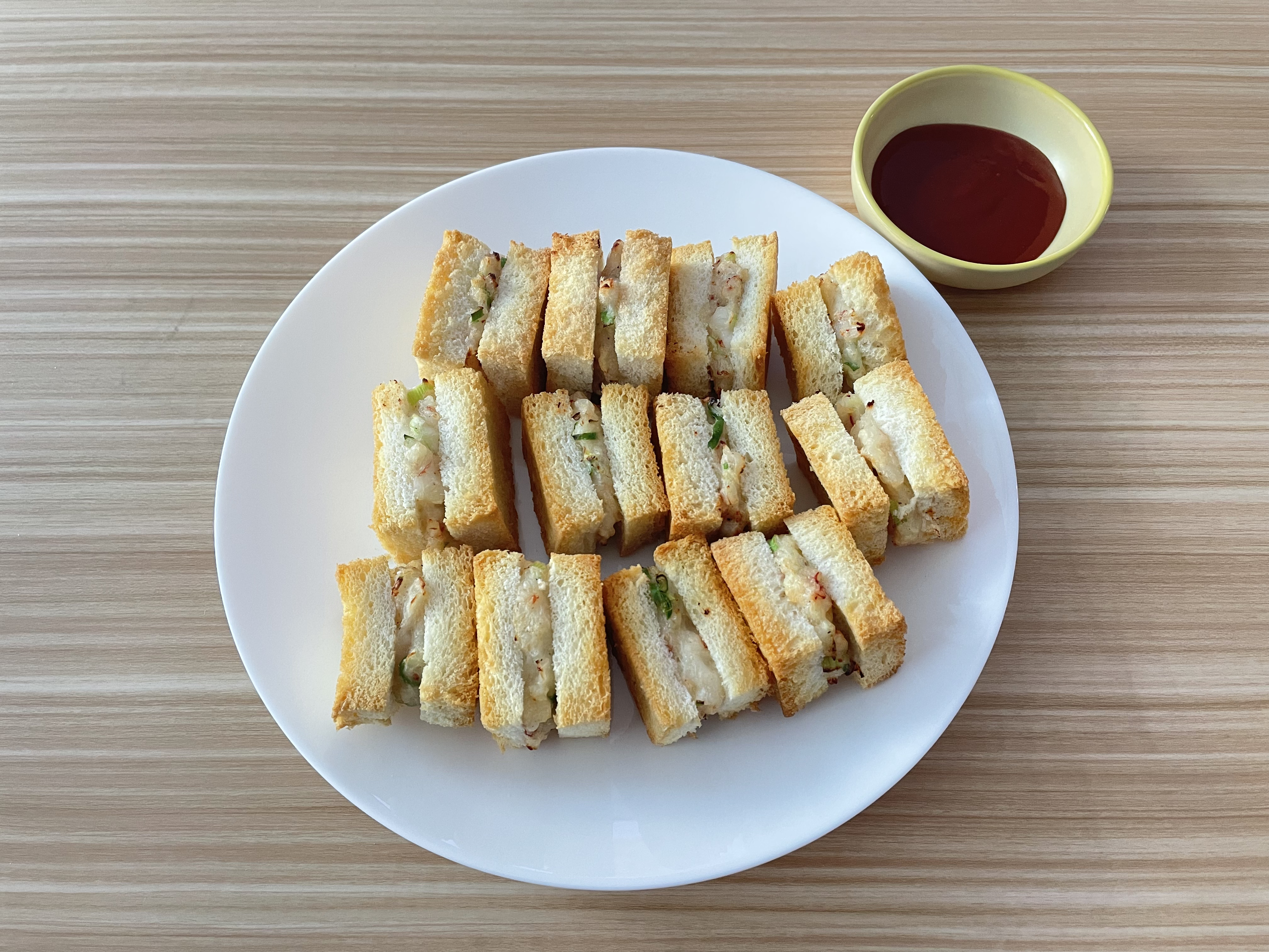 맛있게 익은 멘보샤에 악어케찹을 더했다.
