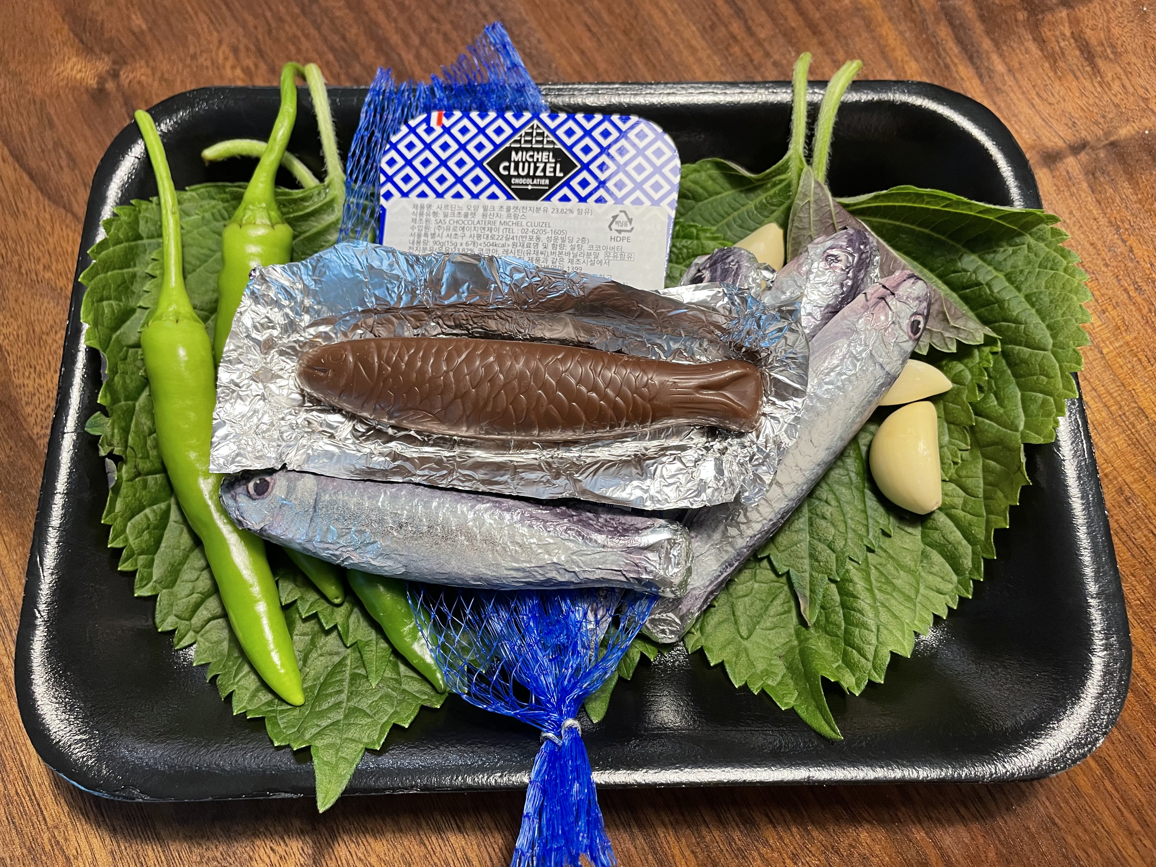 포장을 벗겨보고 나서야 진짜 정어리가 아니고 초콜릿인걸 알았다.
