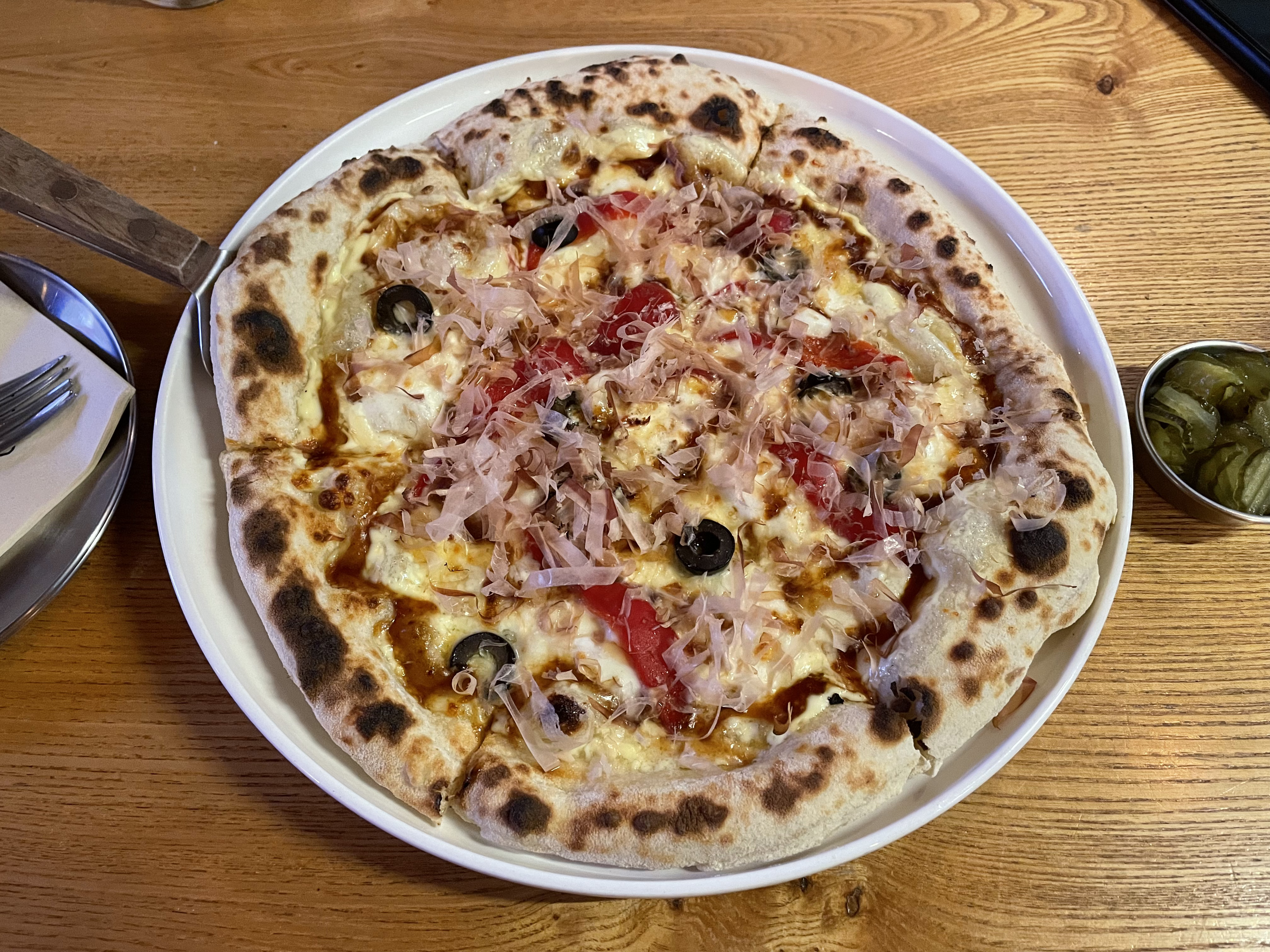 짝꿍이 좋아라 하는 얇은 도우에 신선한 재료랑 치즈가 잔뜩 올라가 있다.