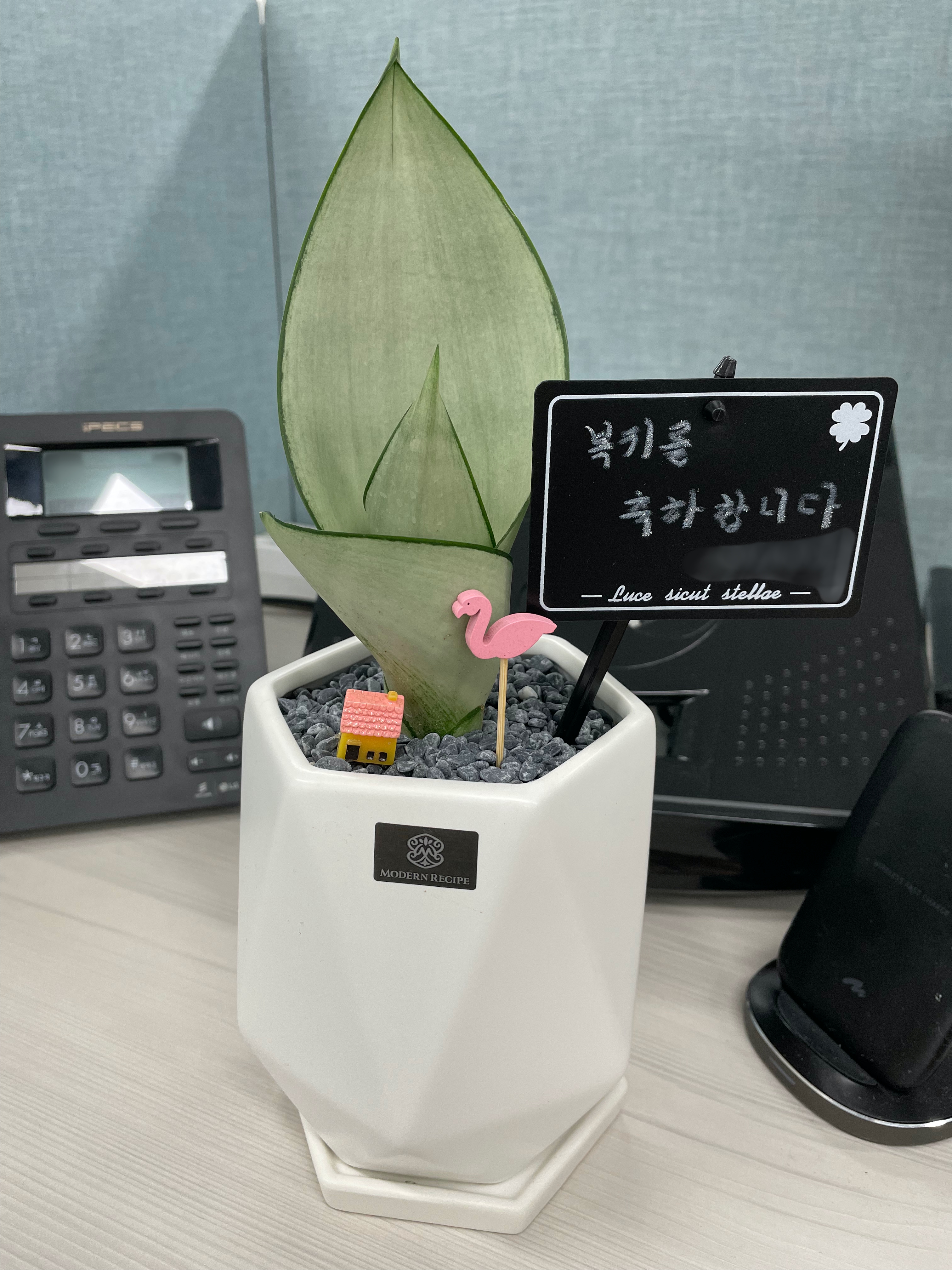 복귀 축하 메시지가 쓰여있는 예쁜 화분이 자리에서 날 반겨주었다.