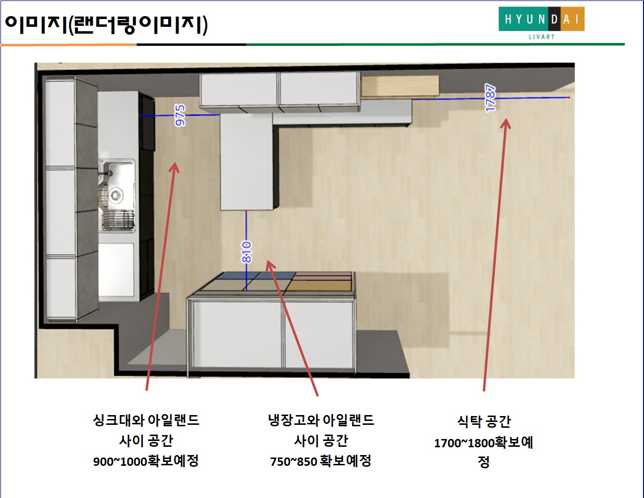 냉장고랑 아일랜드 사이가 좁은거 아닌가 걱정됐지만 모델링해보니 불편함 없이 다닐 거리 충분했다.
