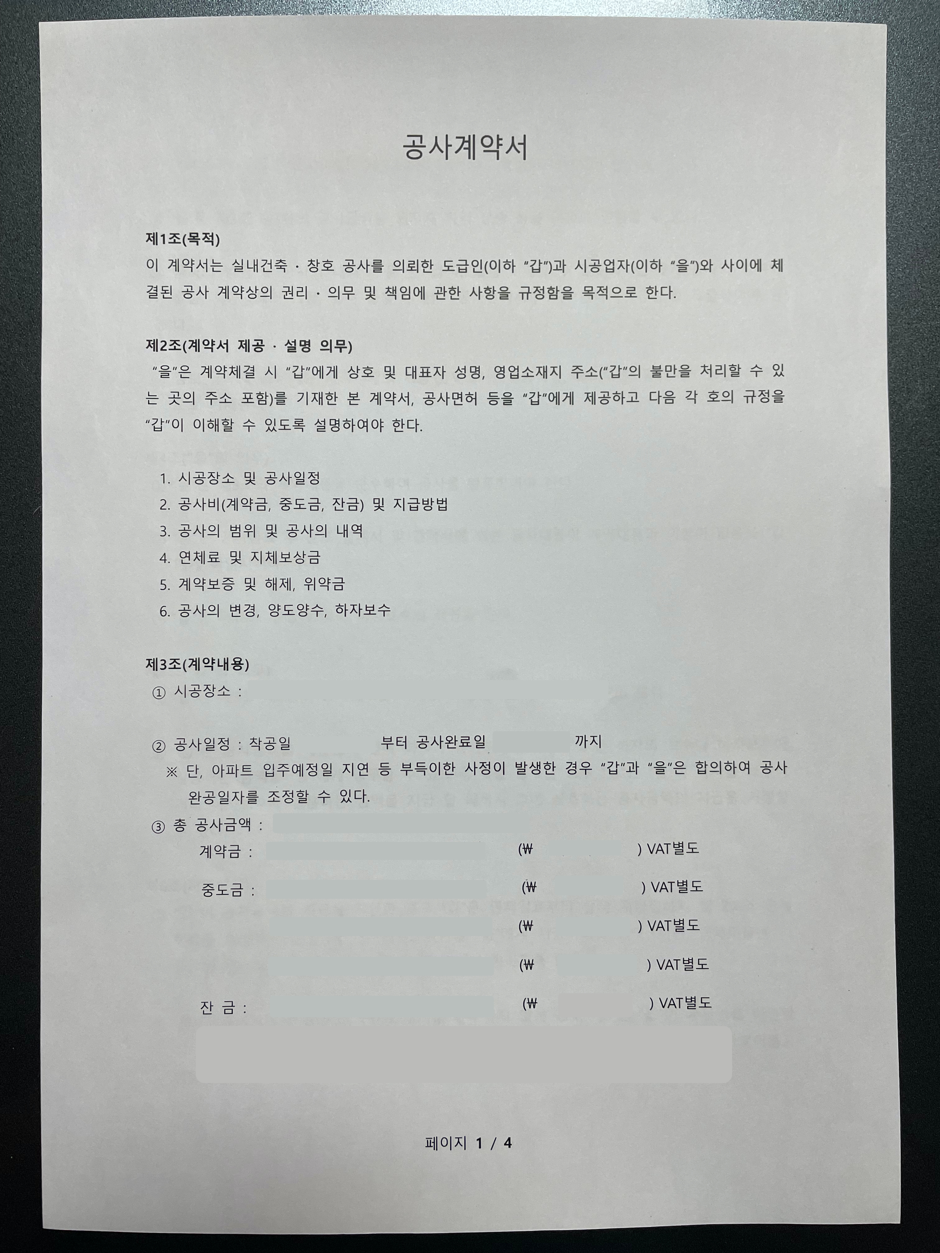 공사 일정표를 받고 둘이서 계약서랑 견적서 검토하다보니 조금 안 맞는 것 같았다.