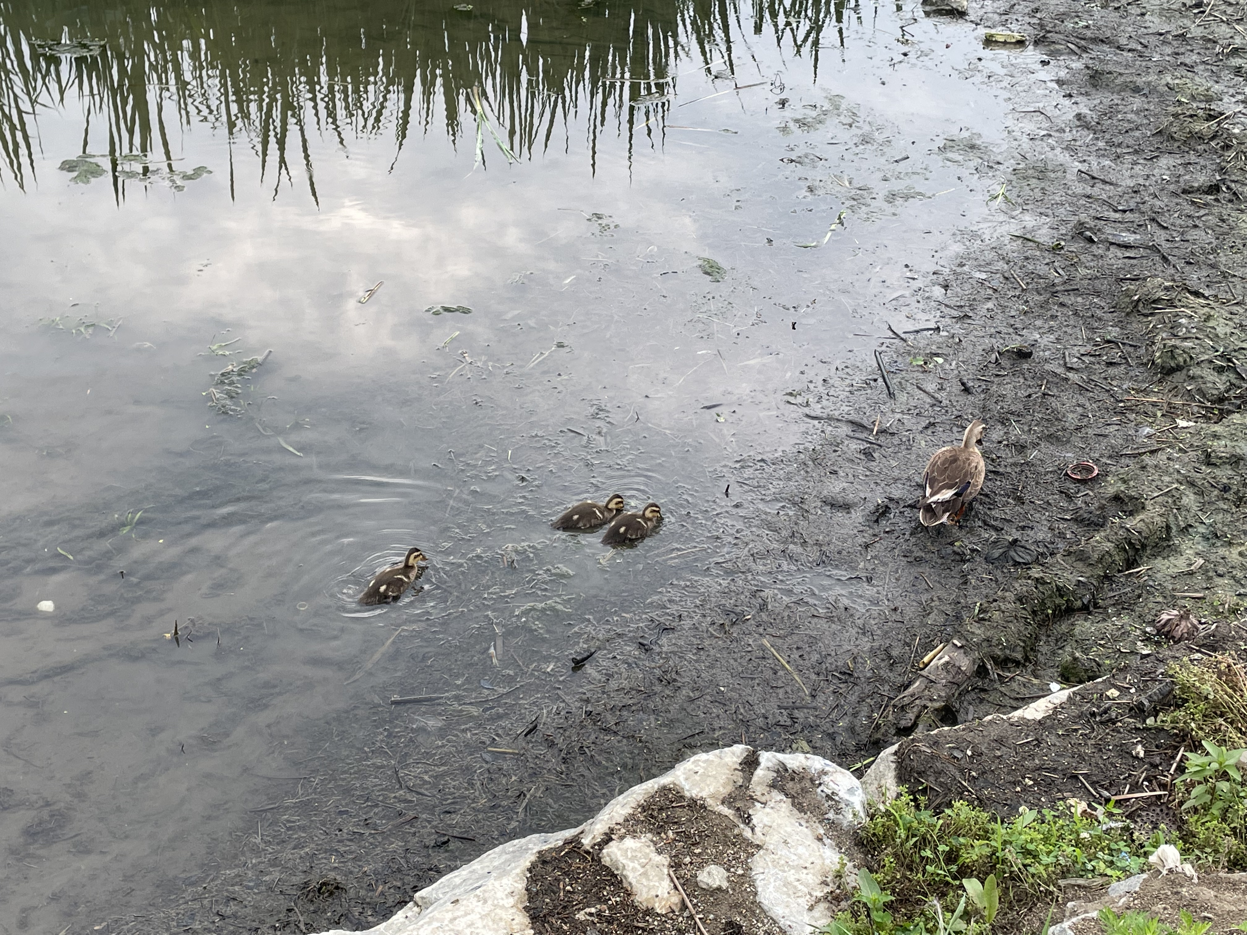 물가로 오리 가족 지나가고 있었다.