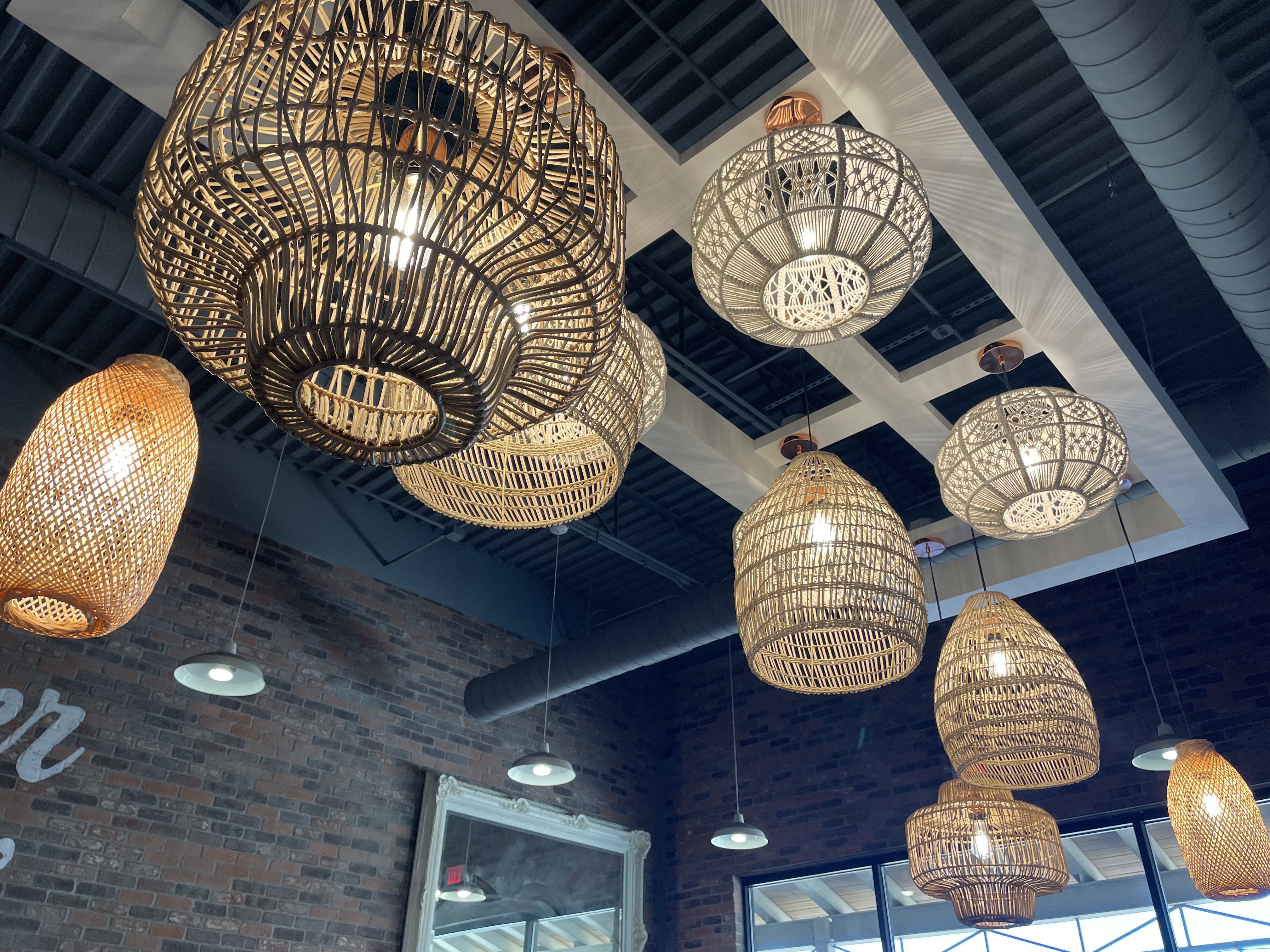 천장에 잔뜩 매달려있는 라탄 전등들.