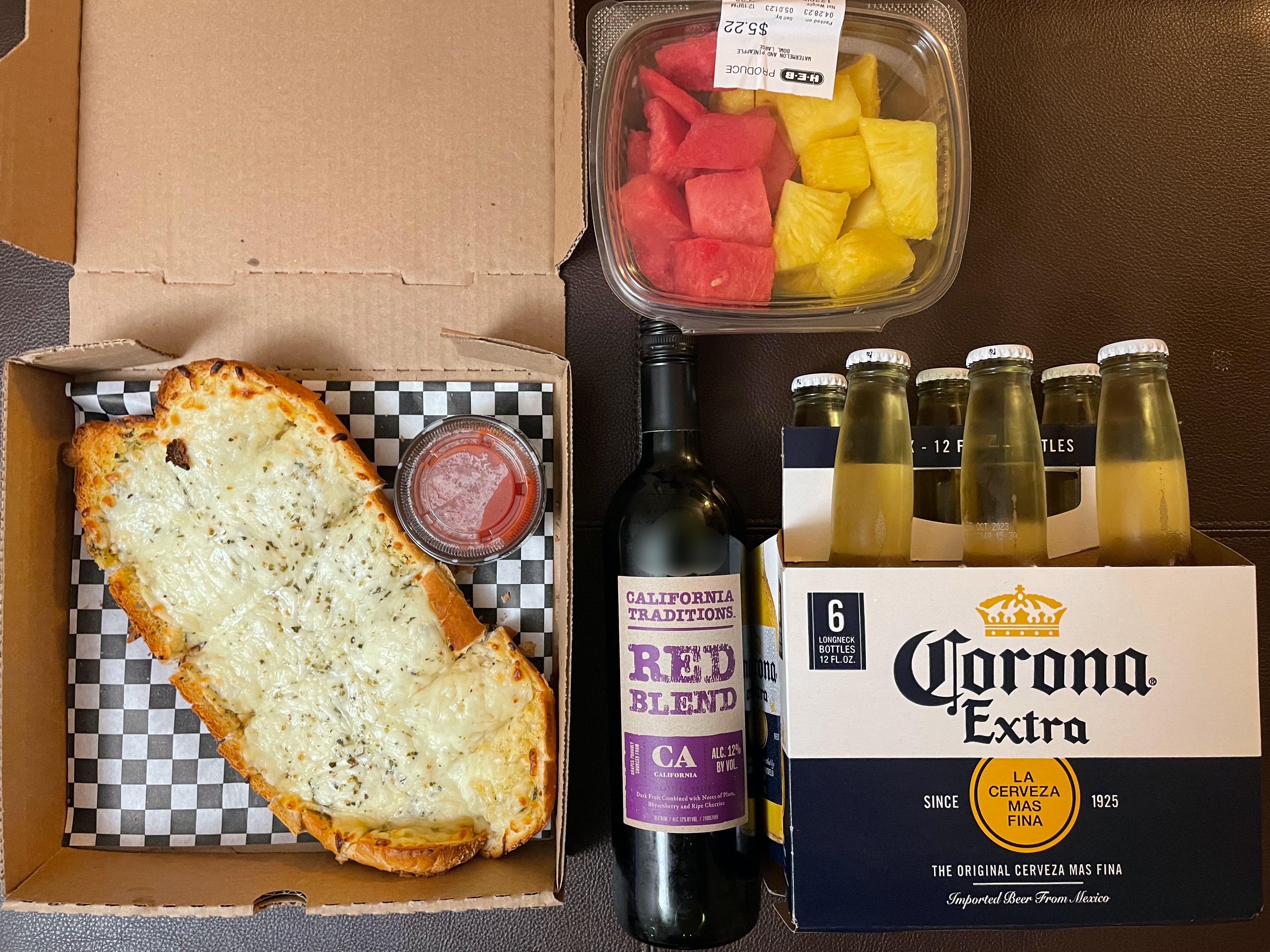 포장해 온 Cheese Garlic Bread랑 마트에서 사 온 와인과 맥주, 그리고 과일 한팩.