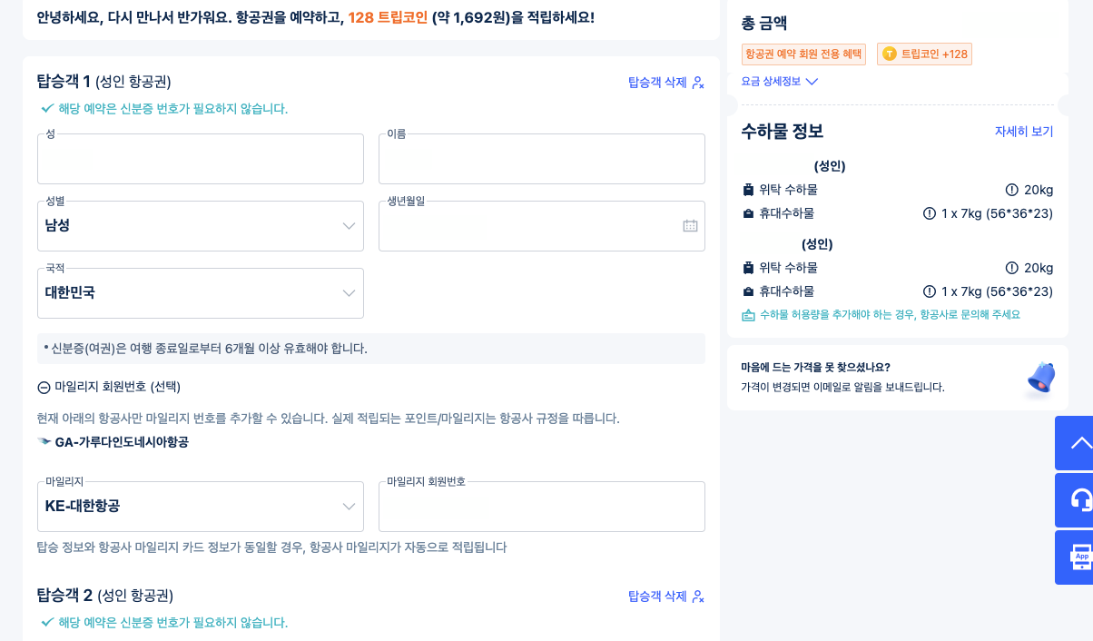 첫 번째 항공편 서울 <-> 자카르타 예약 완료.