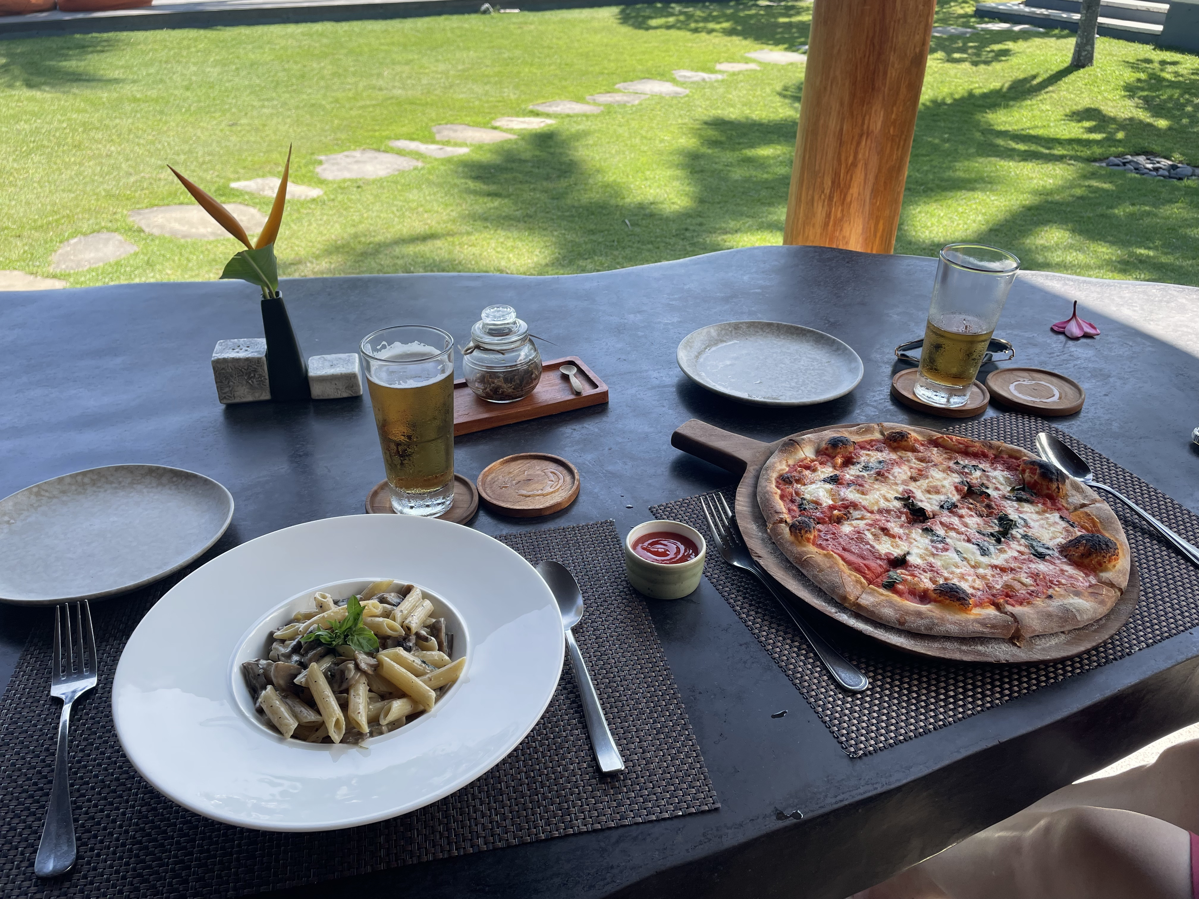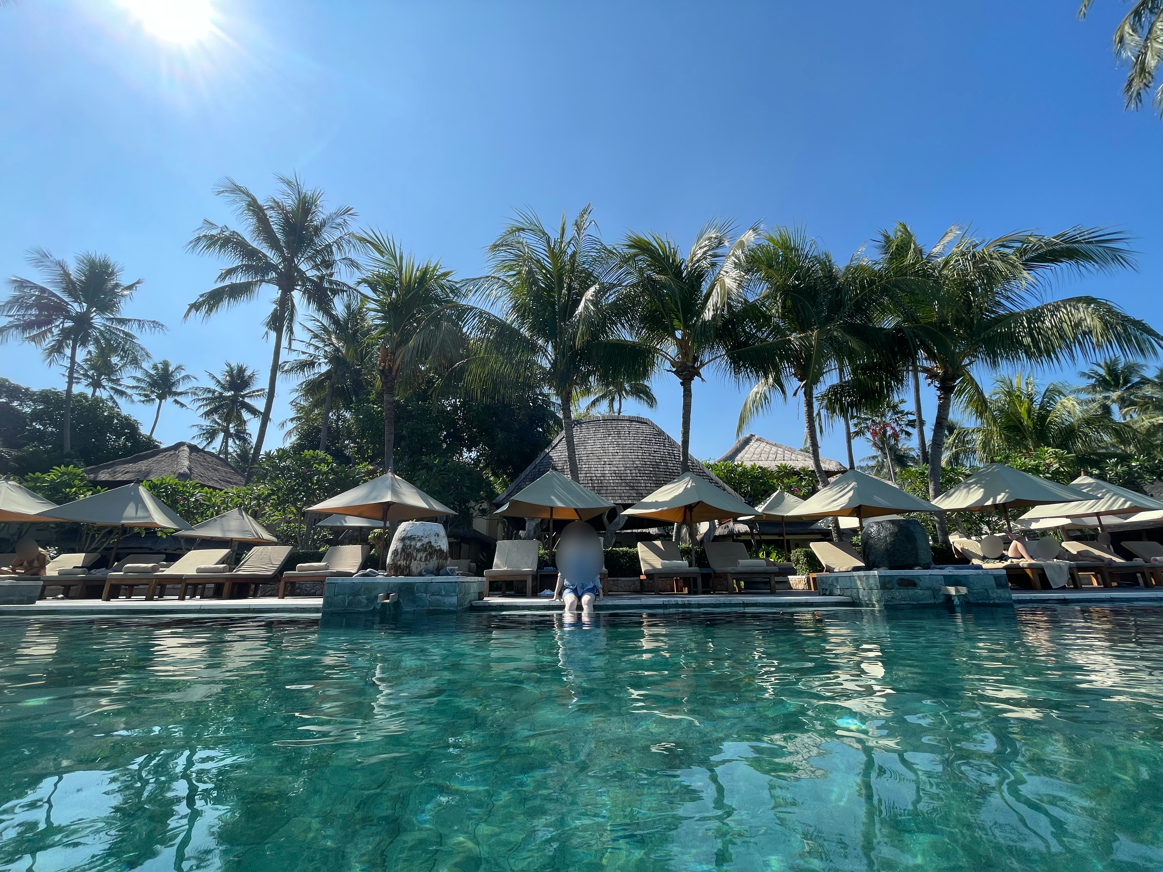 수영장 바로 앞 비치베드에 자리 잡았다.