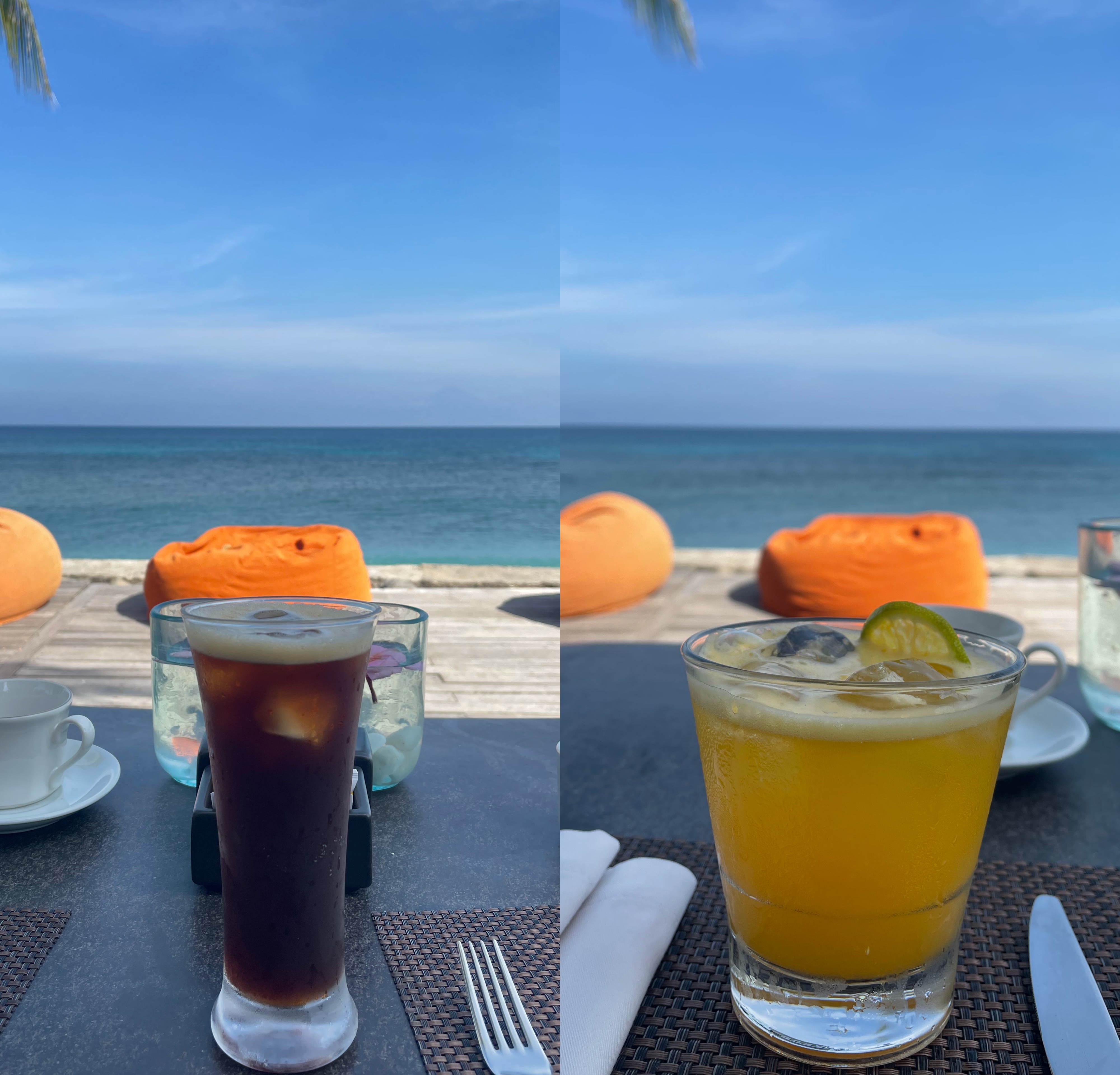 오늘 조식은 바닷가 테이블에 자리를 잡았다.