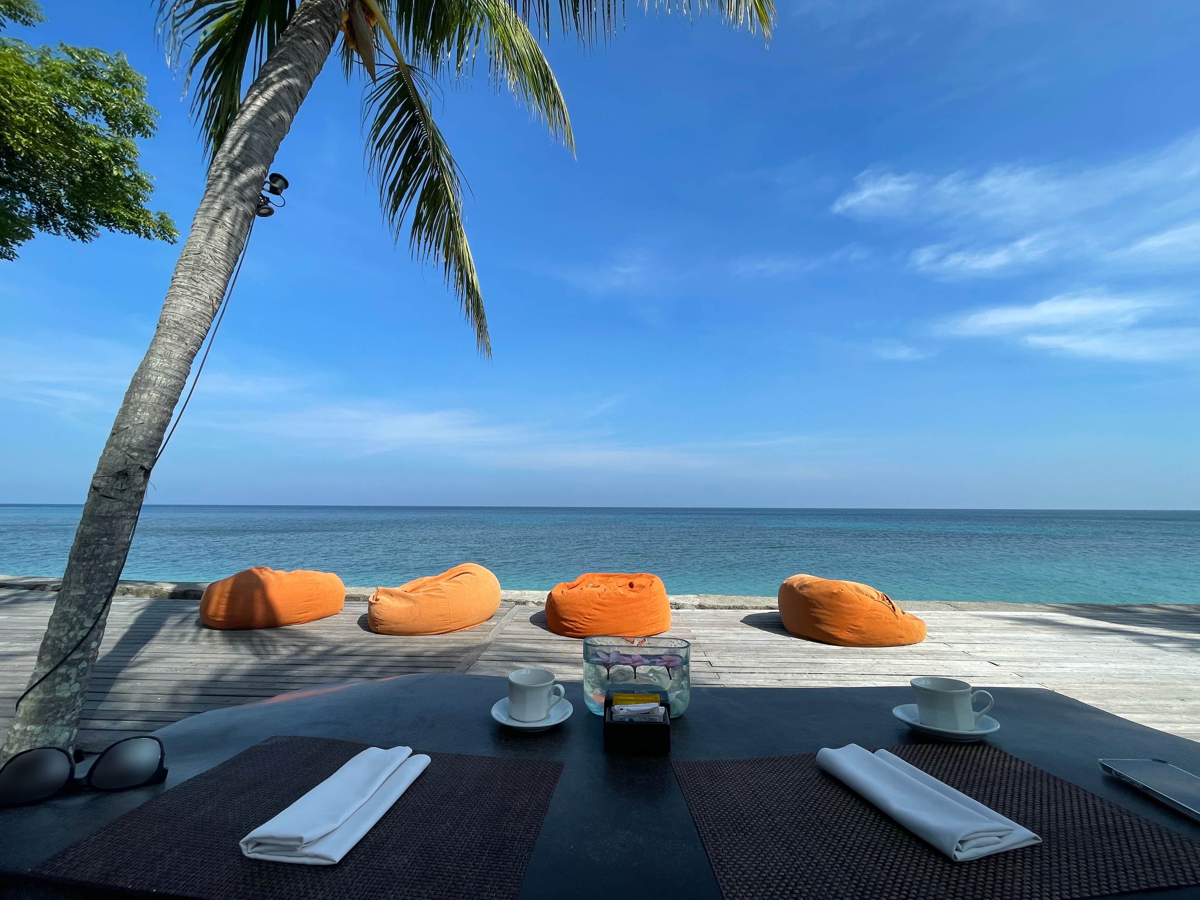 오늘 조식은 바닷가 테이블에 자리를 잡았다.