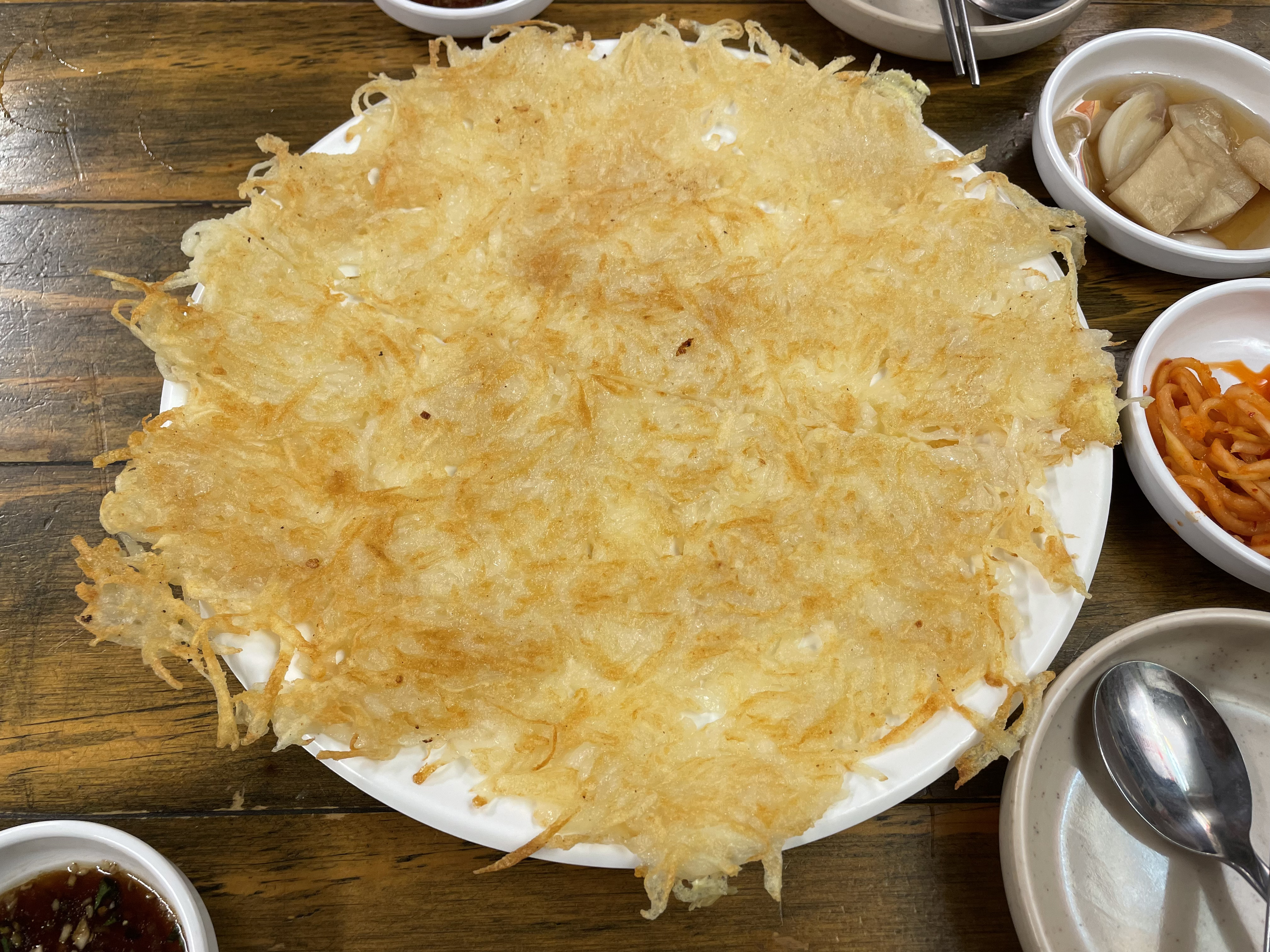얇게 채썬 감자에 강판에 직접 간 것 같은 감자로 버무려 바삭하게 익혔다.