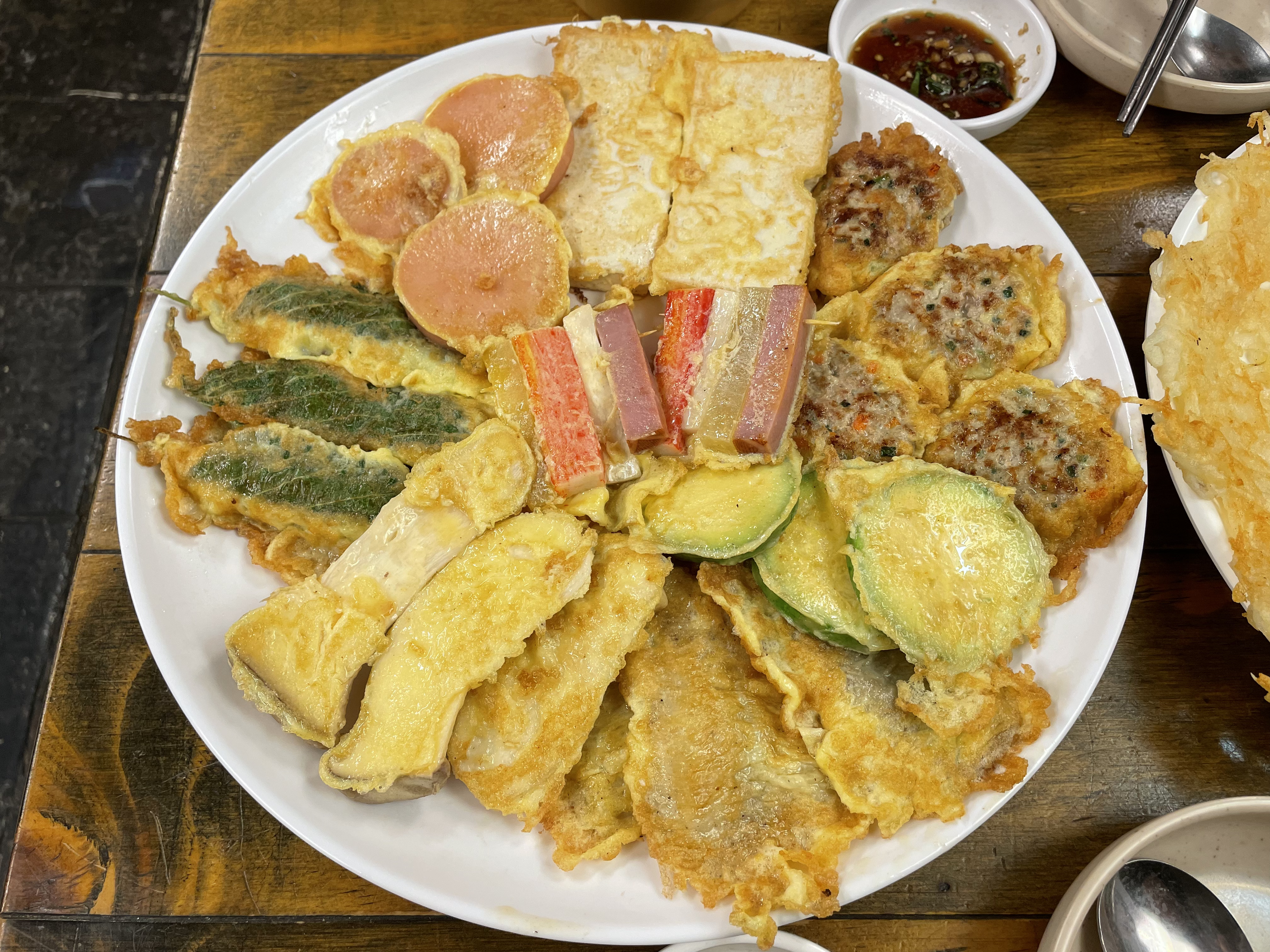 두부와, 깻잎과, 버섯, 호박, 동그랑땡, 소시지, 생선전에 꼬치까지.