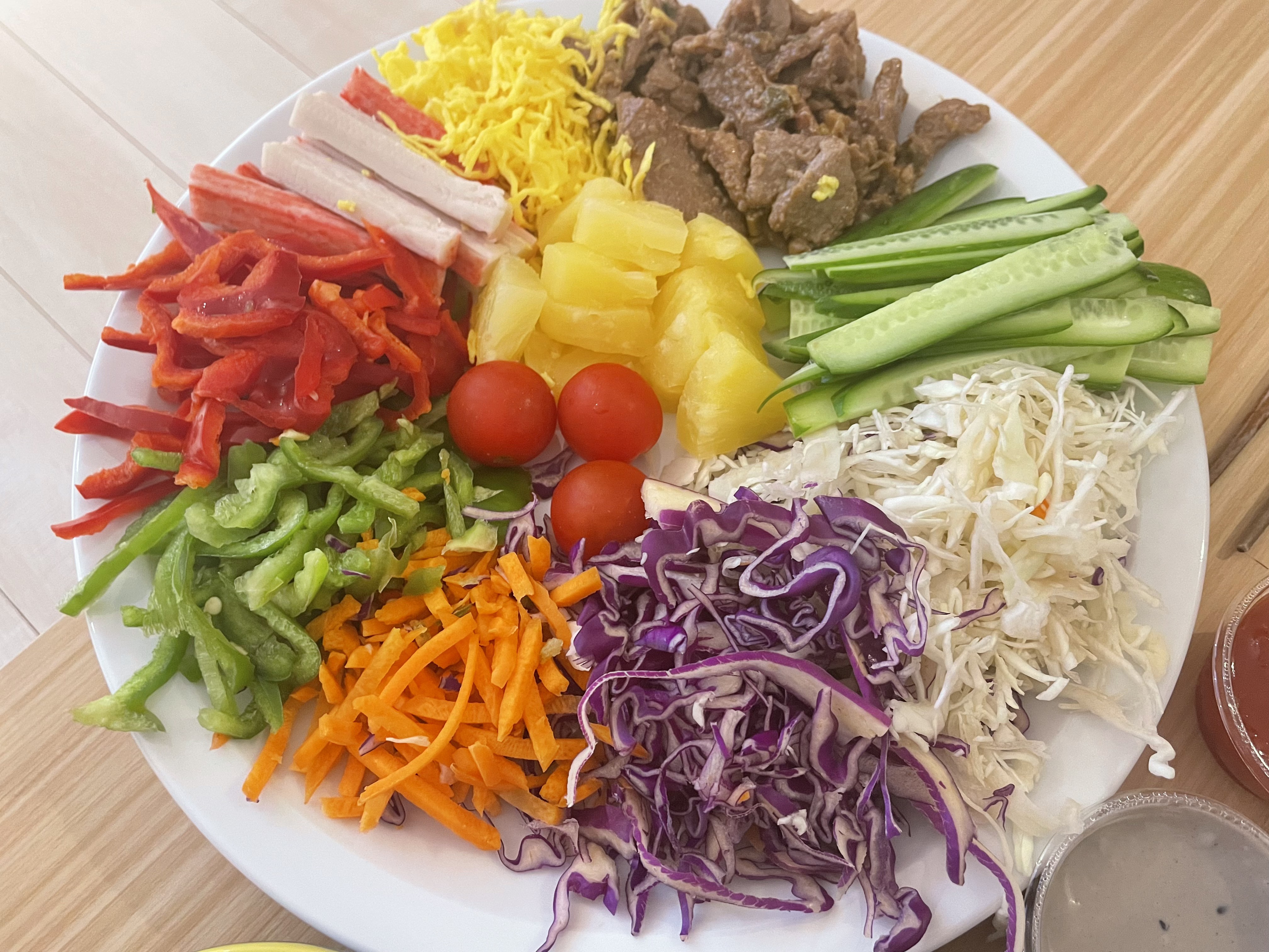 먹고 싶은 재료들을 이것저것 담고 라이스페이퍼로 감싸준다.