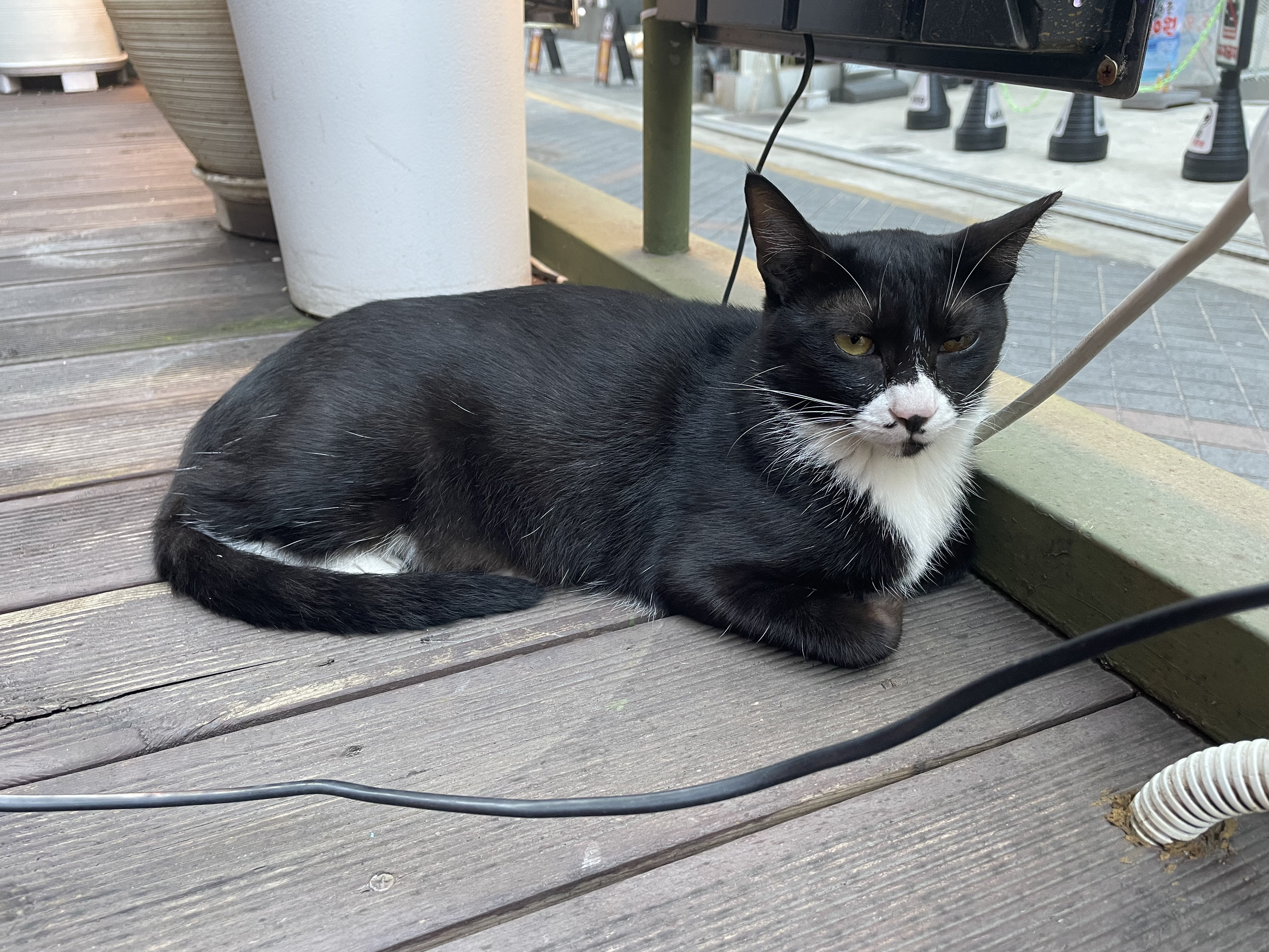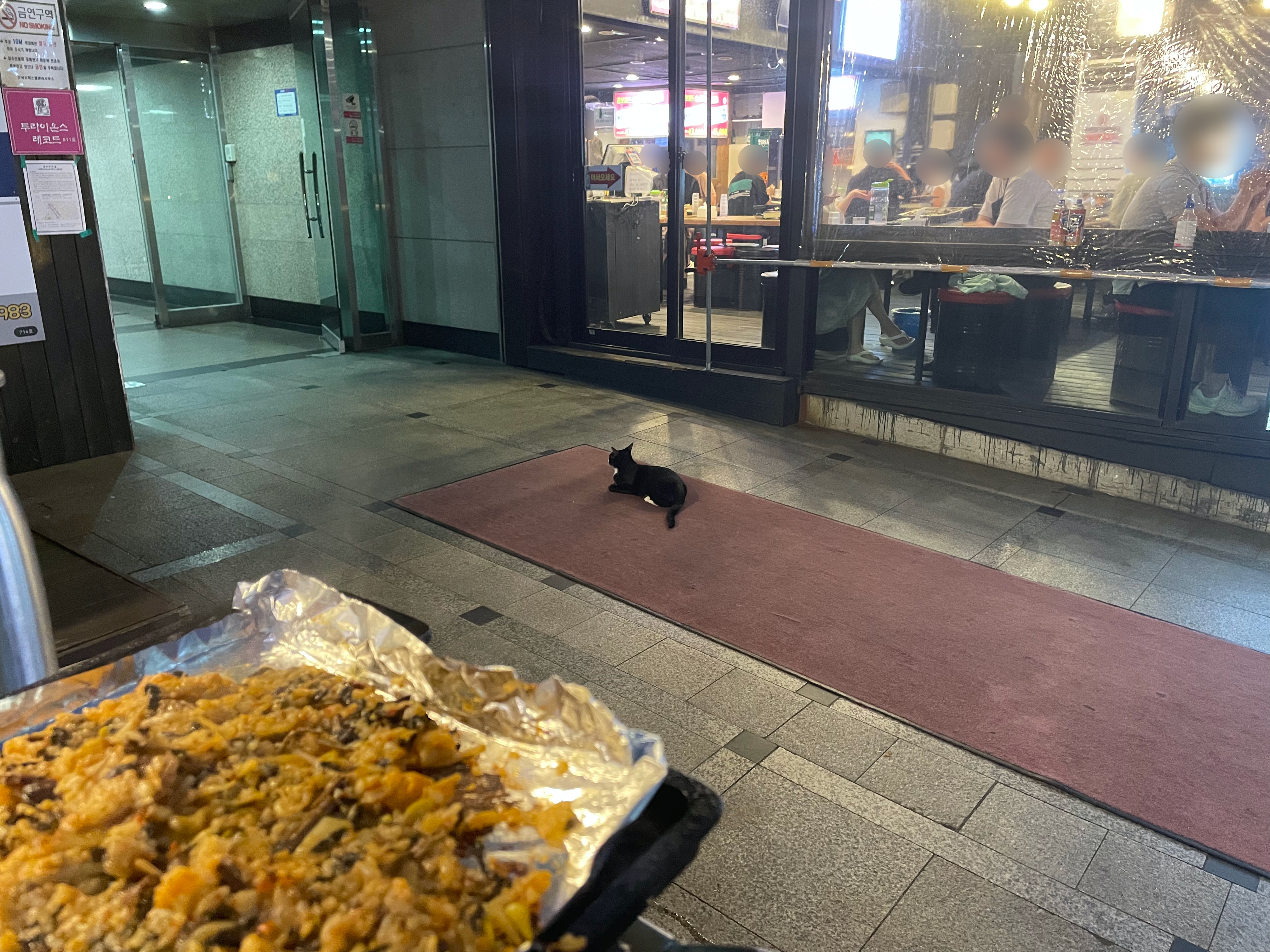 고양이가 어느새 건물 입구 한가운데 자리 잡았다.