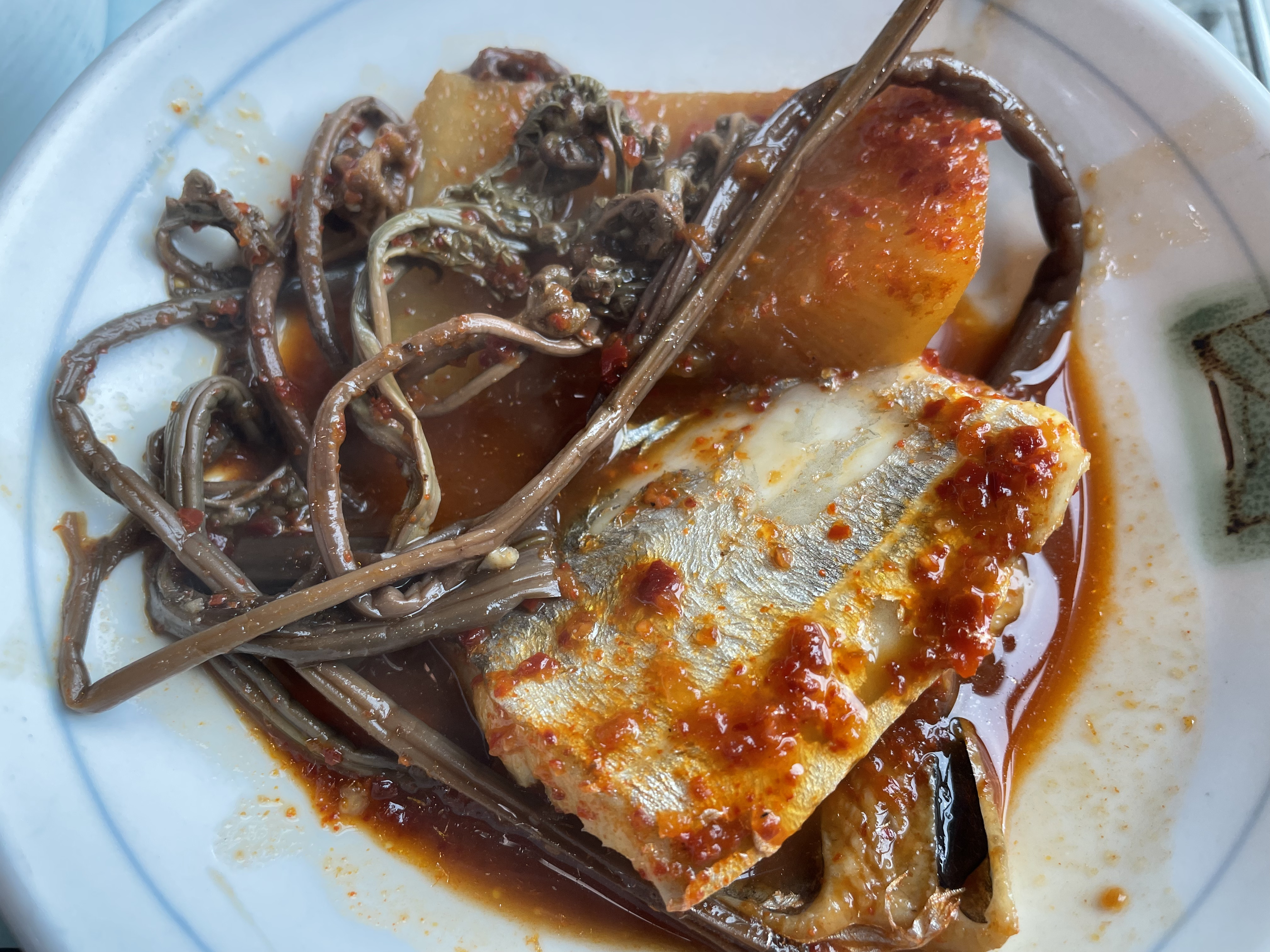 갈치조림 한 조각 무 한 조각에 고사리를 얹어 먹는다.