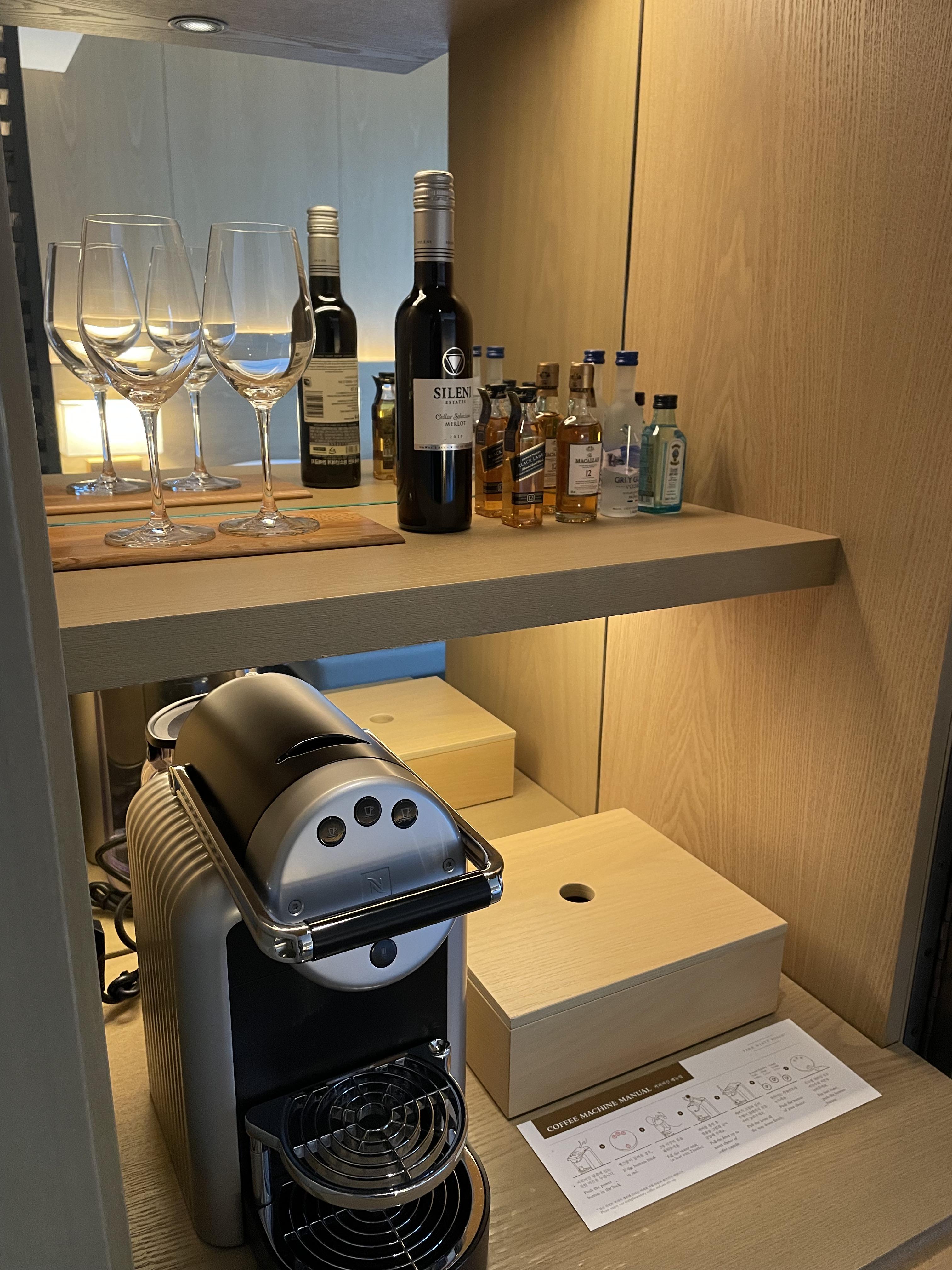 미니바에는 작은 잔들과 여러 가지 차, 캡슐거피가 있다.