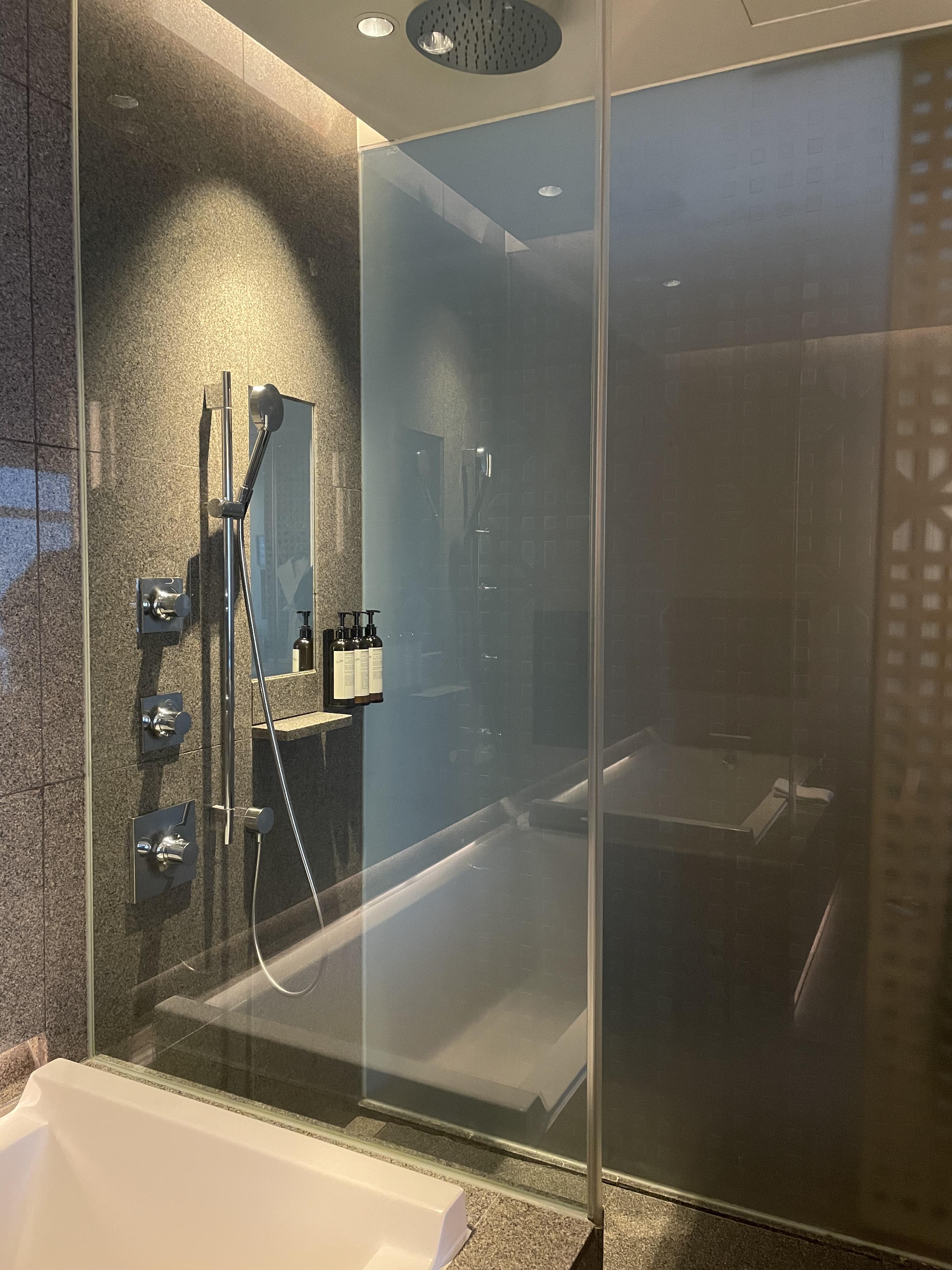 넓은 샤워부스는 샤워기와 해바라기 샤워기가 있다.
