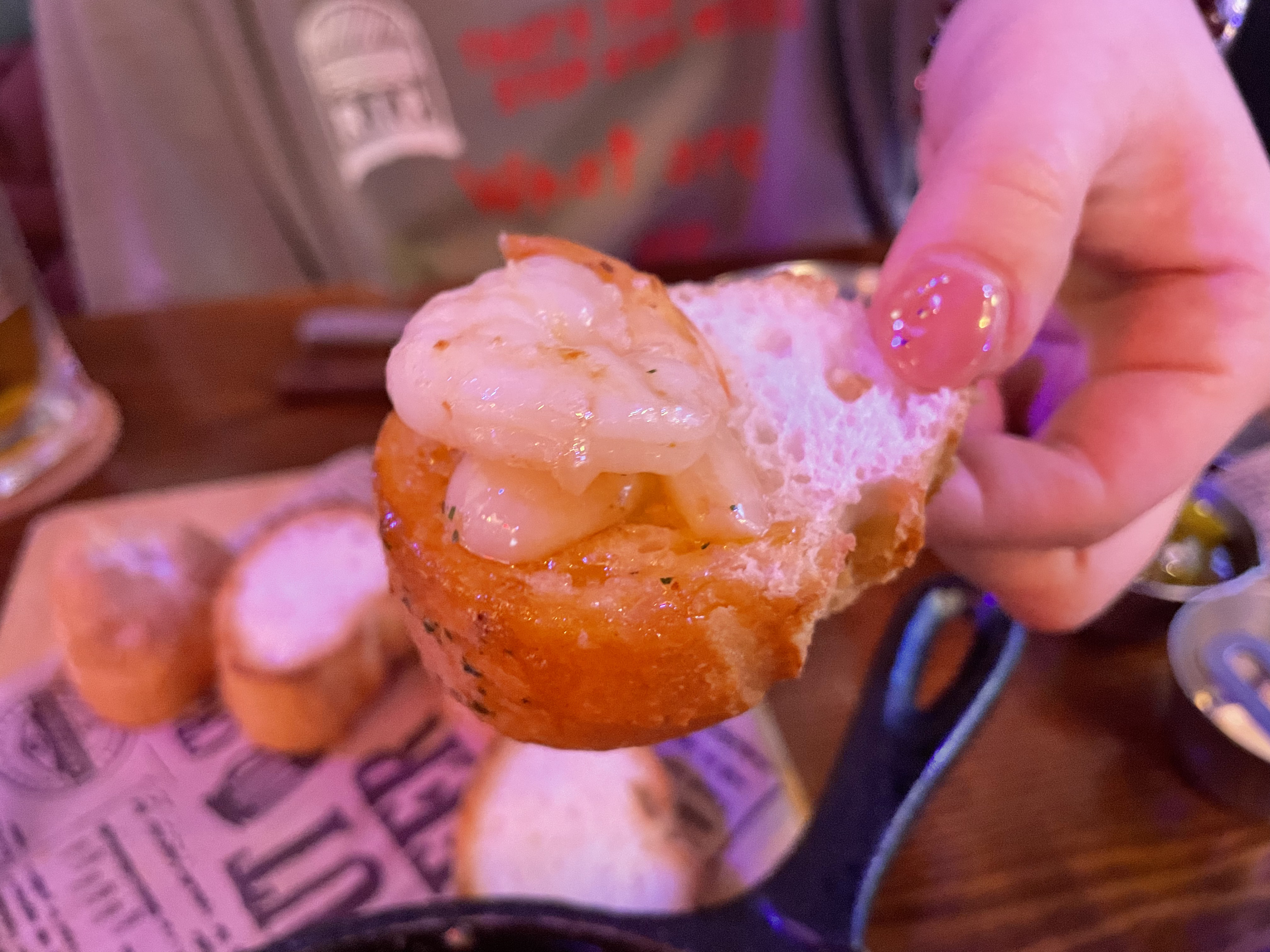 같이 나오는 바게트빵을 푹 찍어 새우 한 마리랑 마늘 얹어 같이 먹는다.