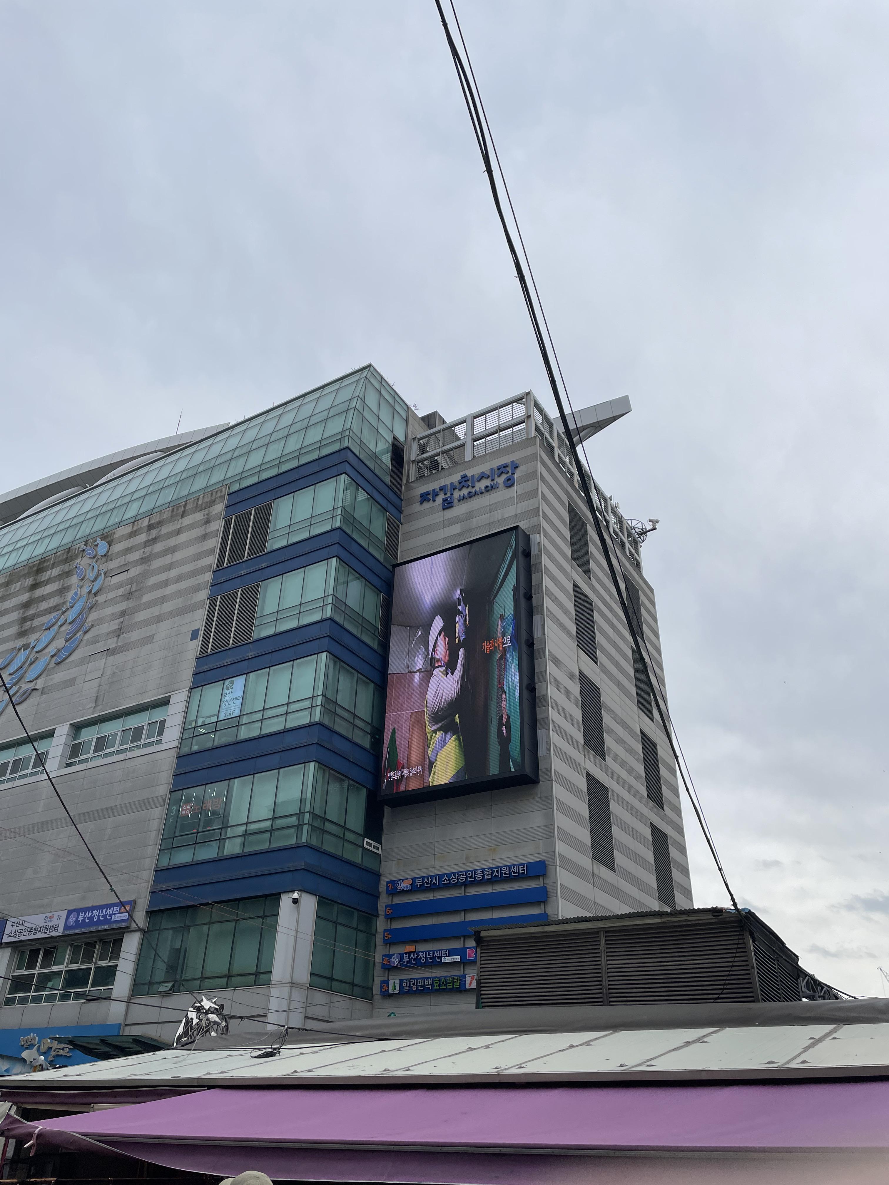 자갈치 시장의 가판대들 사이로 큰 건물도 있다.