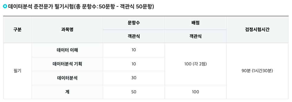 데이터분석 준전문가 자격시험은 실기시험은 없으며 필기시험은 PBT(Paper Based Test) 방식으로 자격을 검정하며, 필기시험 합격기준 요건을 충족하면 최종합격자로 분류되어 데이터 분석 준전문가