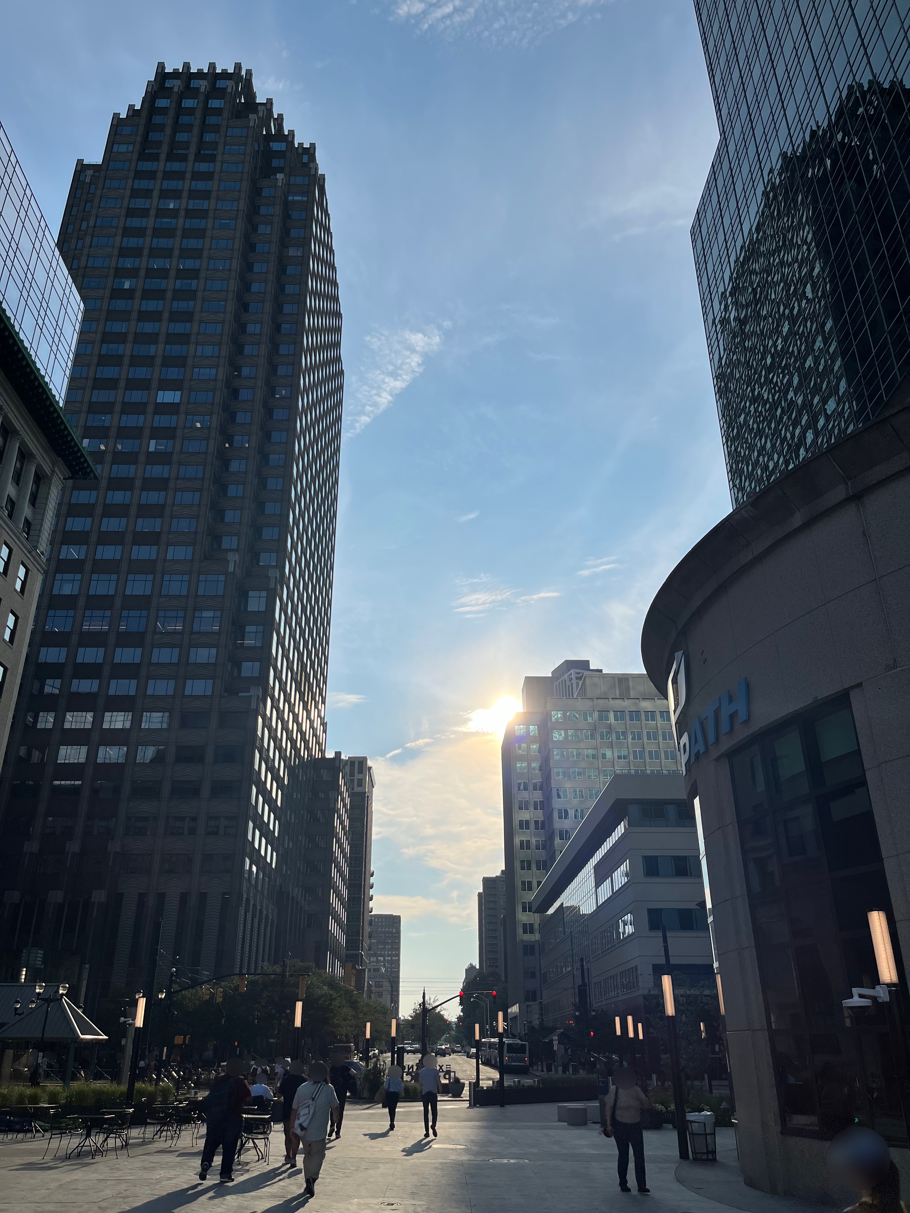 높은 빌딩 사이로 해가 조금씩 지고 있다.