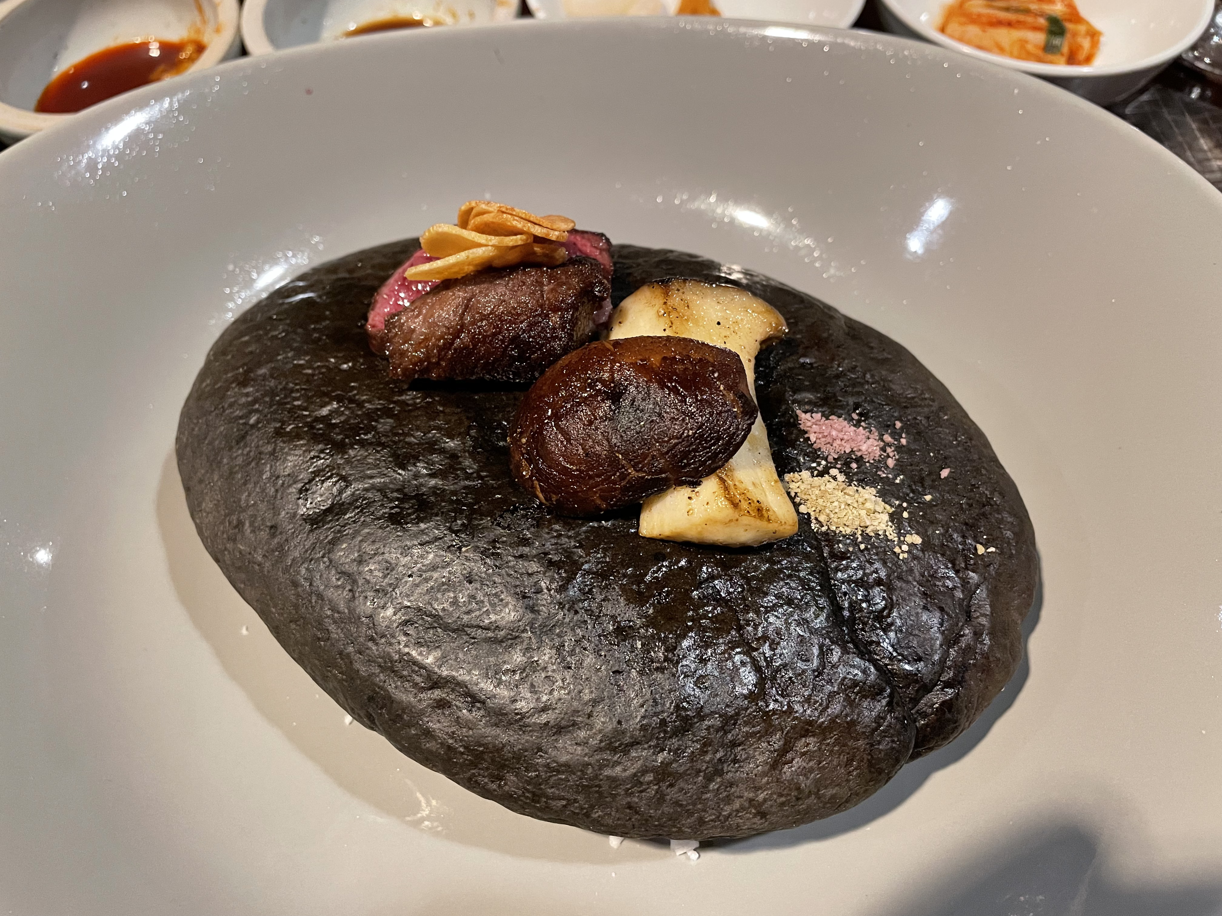 한우 스테이크랑 버섯을 돌 위에 올려준다.