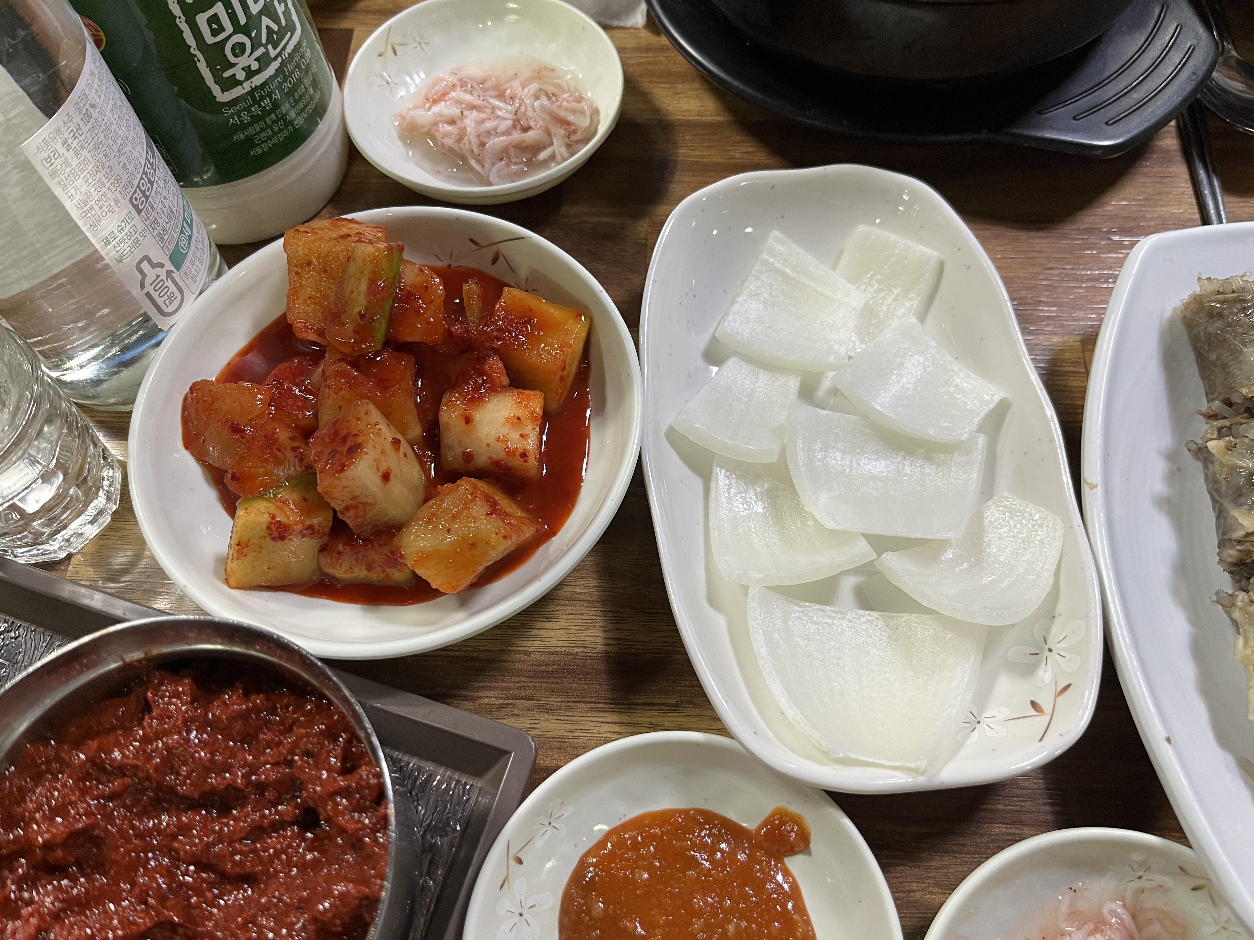 깍두기랑 양파, 새우젓, 쌈장, 청양고추.