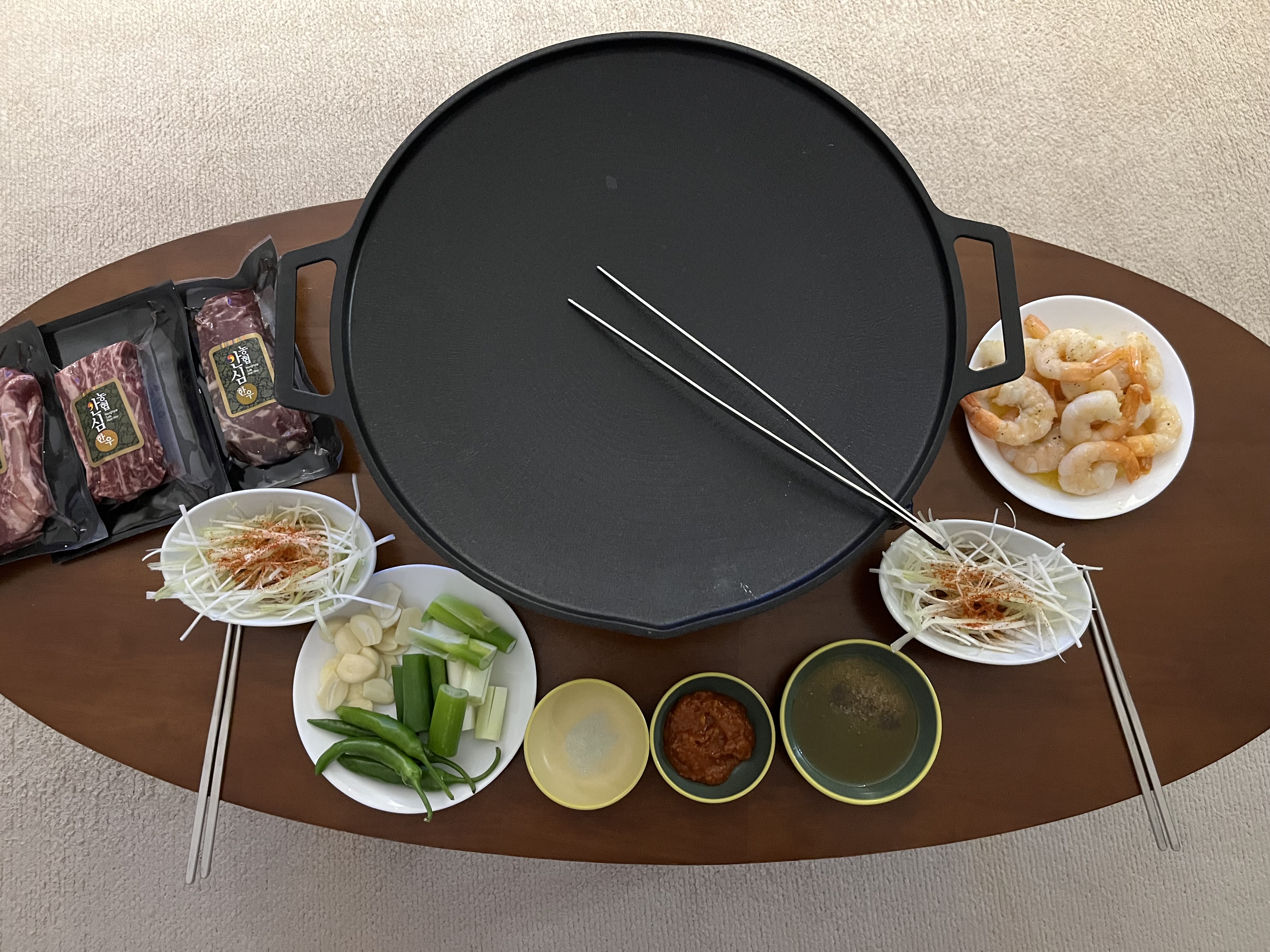 얼마 전 선물 받은 소고기랑 어제 주문해 놓은 새우를 구워 먹기로 했다.