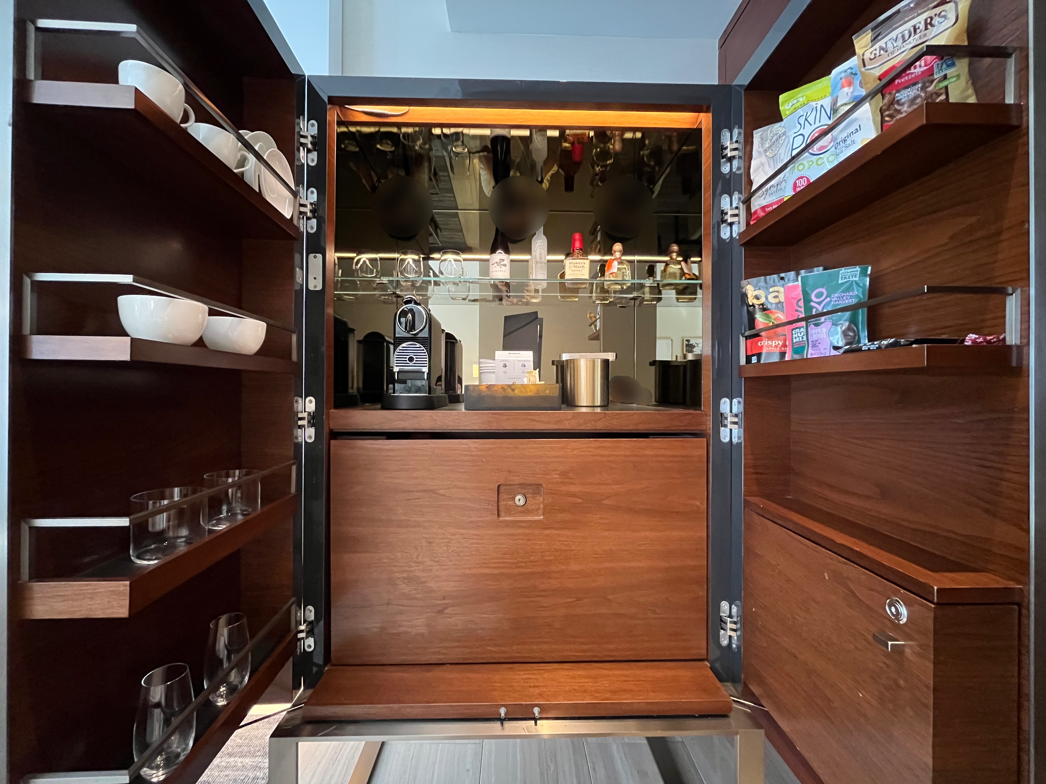 다양한 잔이랑 커피, 차, 과자랑 이것저것 준비되어 있는 미니바.