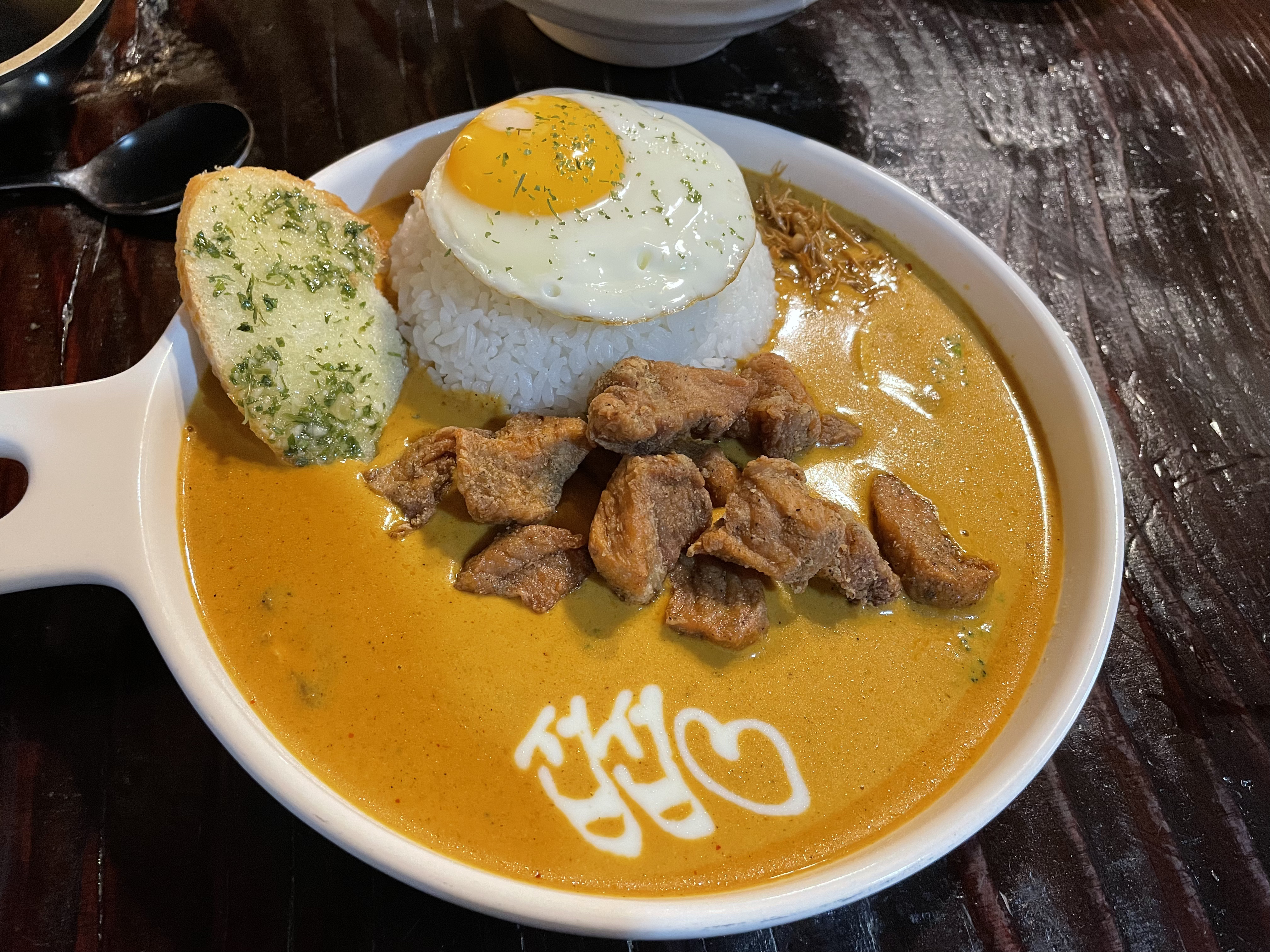 매콤한 카레에 돼지고기 튀김이 바삭하니 맛있다.
