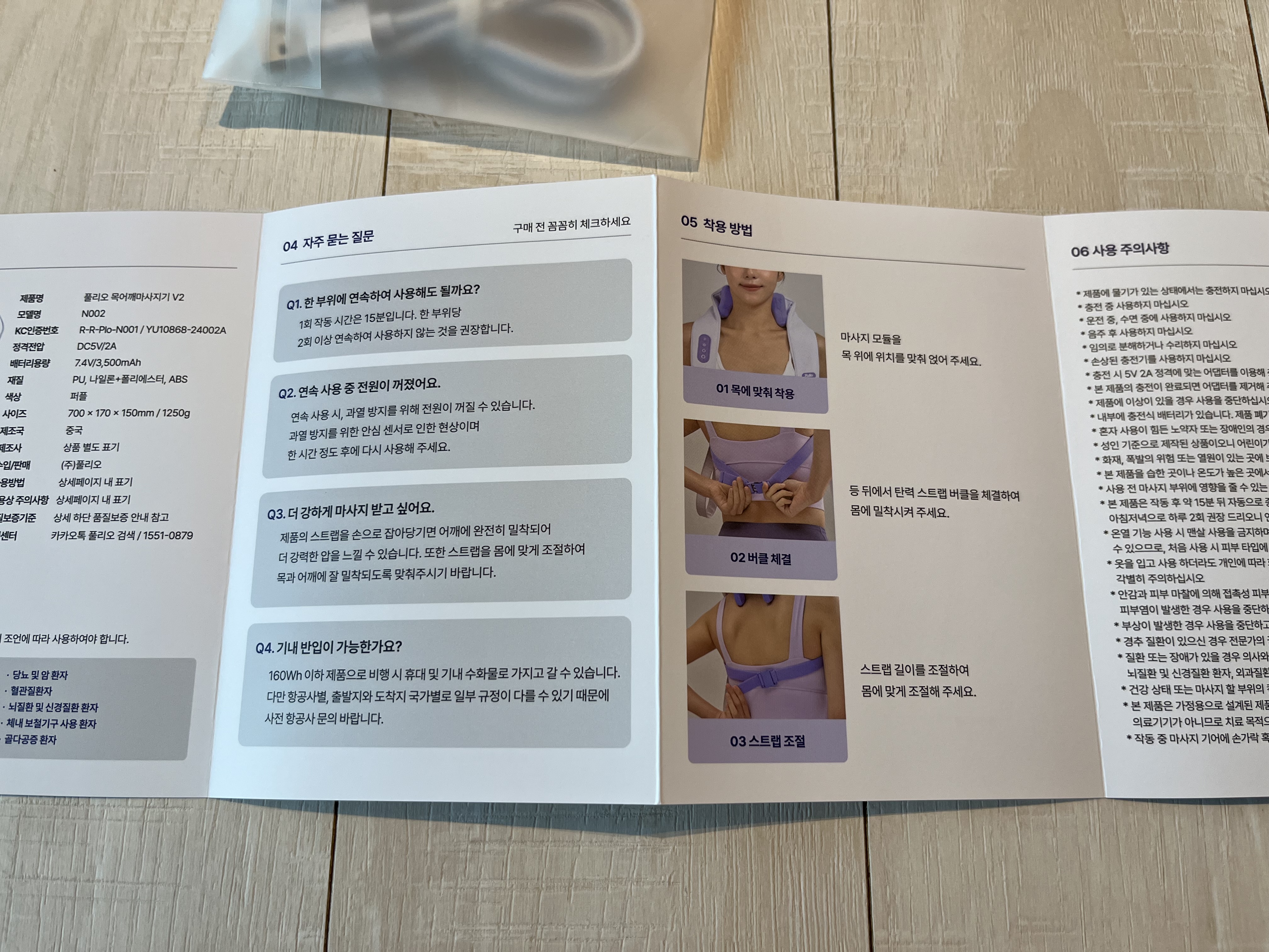 상자 안에는 설명서와 보증서, 그리고 마사지기 본체가 들어있다.