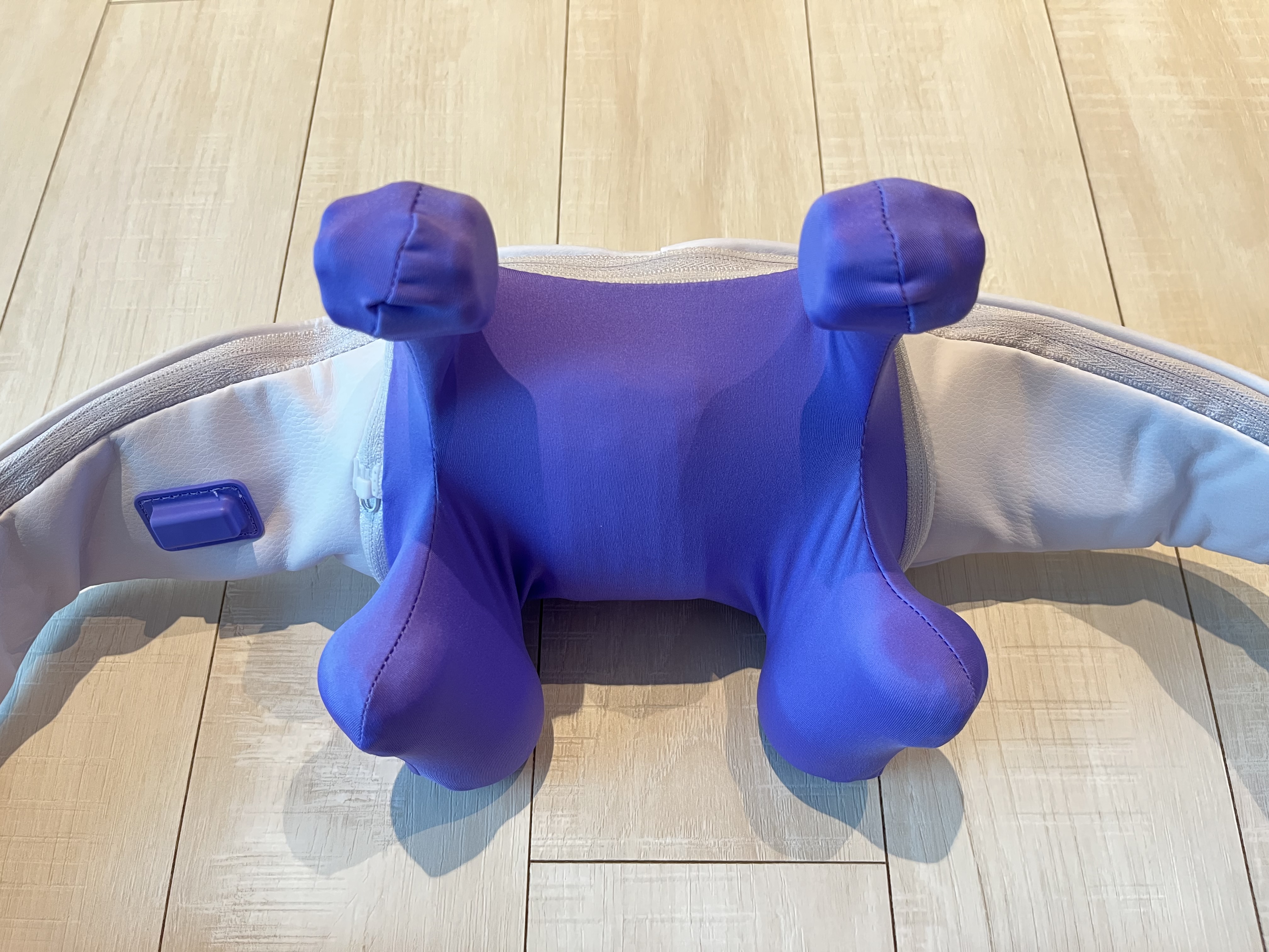 마사지기를 목 위에 올리고 보라색 스트랩을 등 뒤로 해서 버클을 채운다.