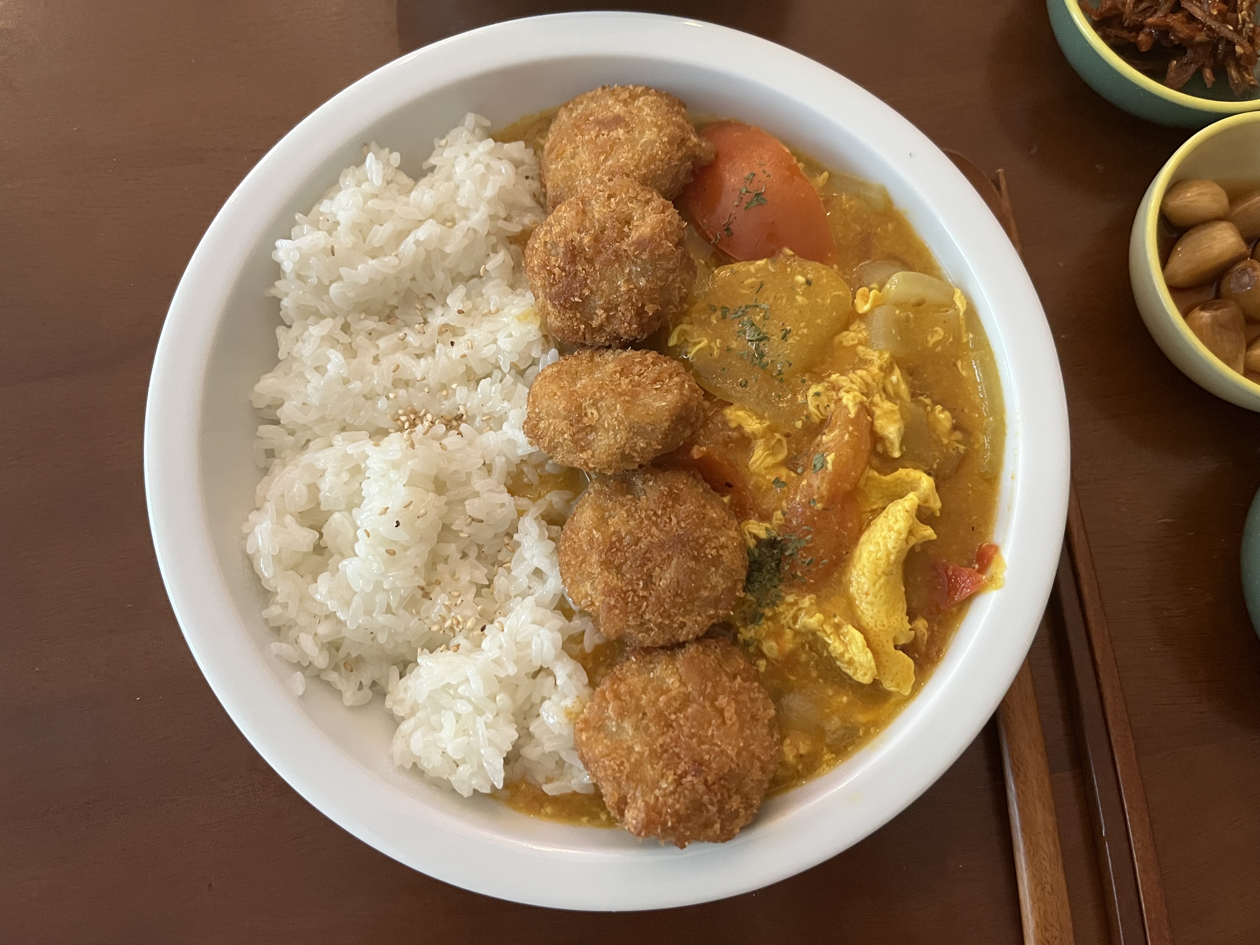 토마토와 계란, 양파와 갖은 야채를 듬뿍 넣은 카레가 보기에도 먹음직스럽다.
