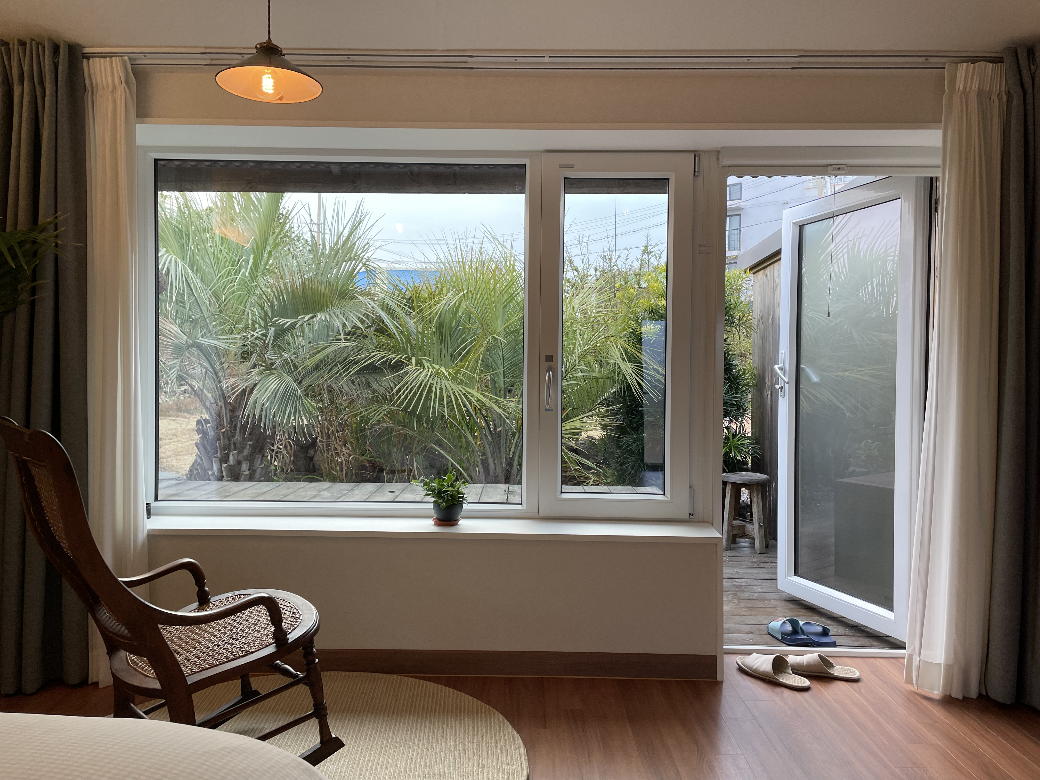 큰 창으로 햇살 받으며, 커피 한잔 하며, 책도 볼 수 있다.