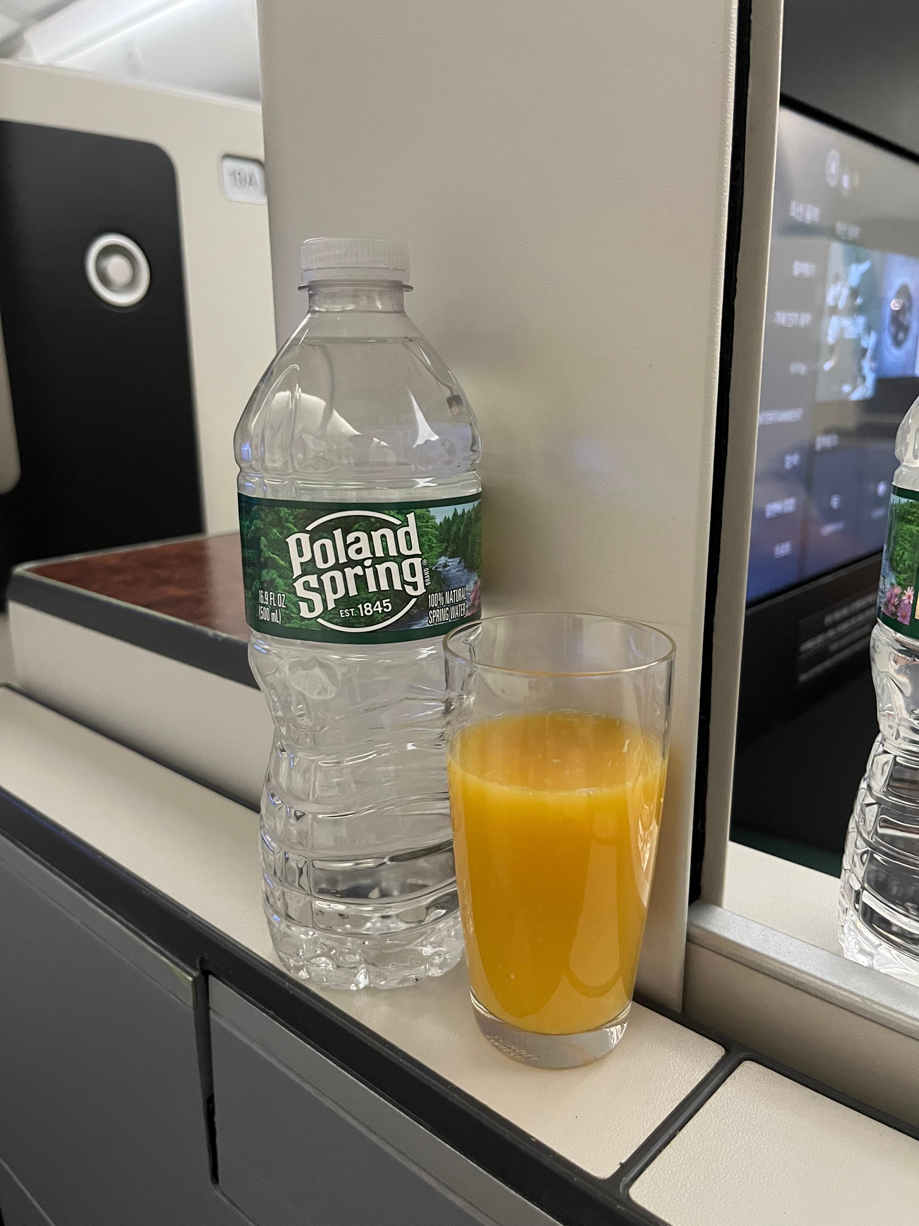 시원한 물 한 병과 새콤달콤한 오렌지주스.