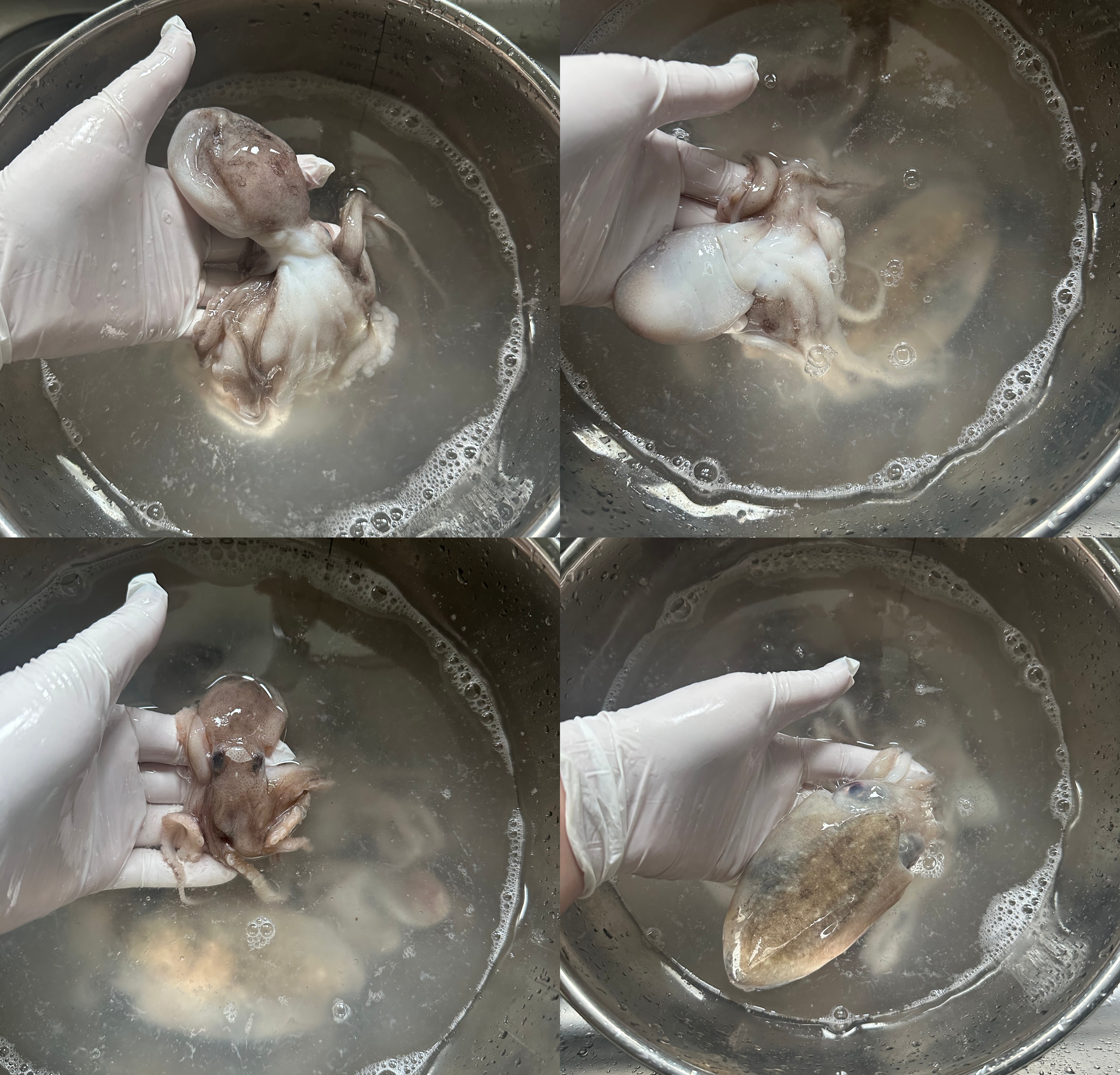 밀가루랑 소금을 뿌려서 쭈꾸미 몸이랑 다리, 빨판에 있는 이물질을 제거한다.