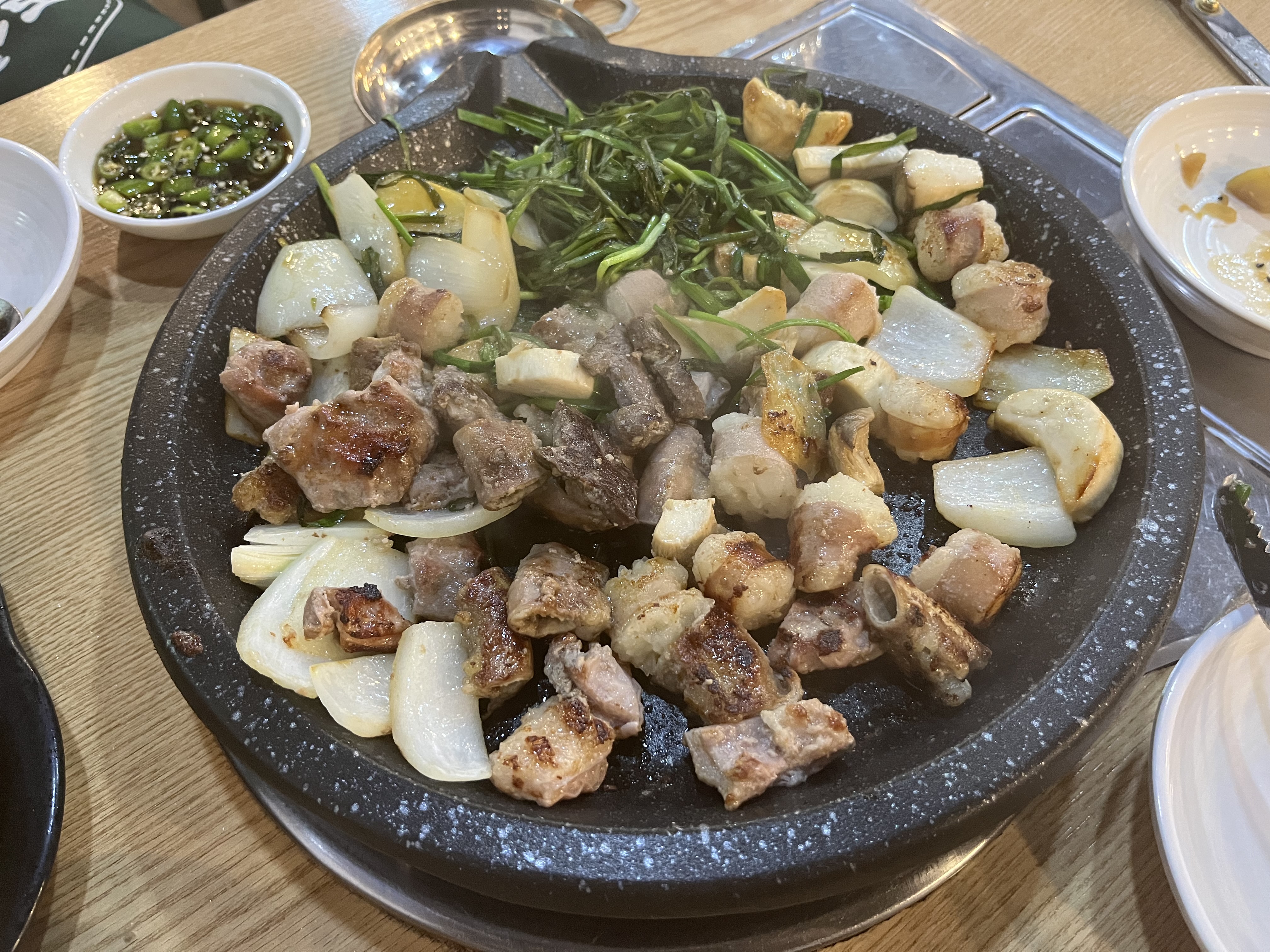 지글지글 돌판에 초벌이 되어 나오니 들오고는 순간부터 맛있는 냄새가 코끝을 자극한다.