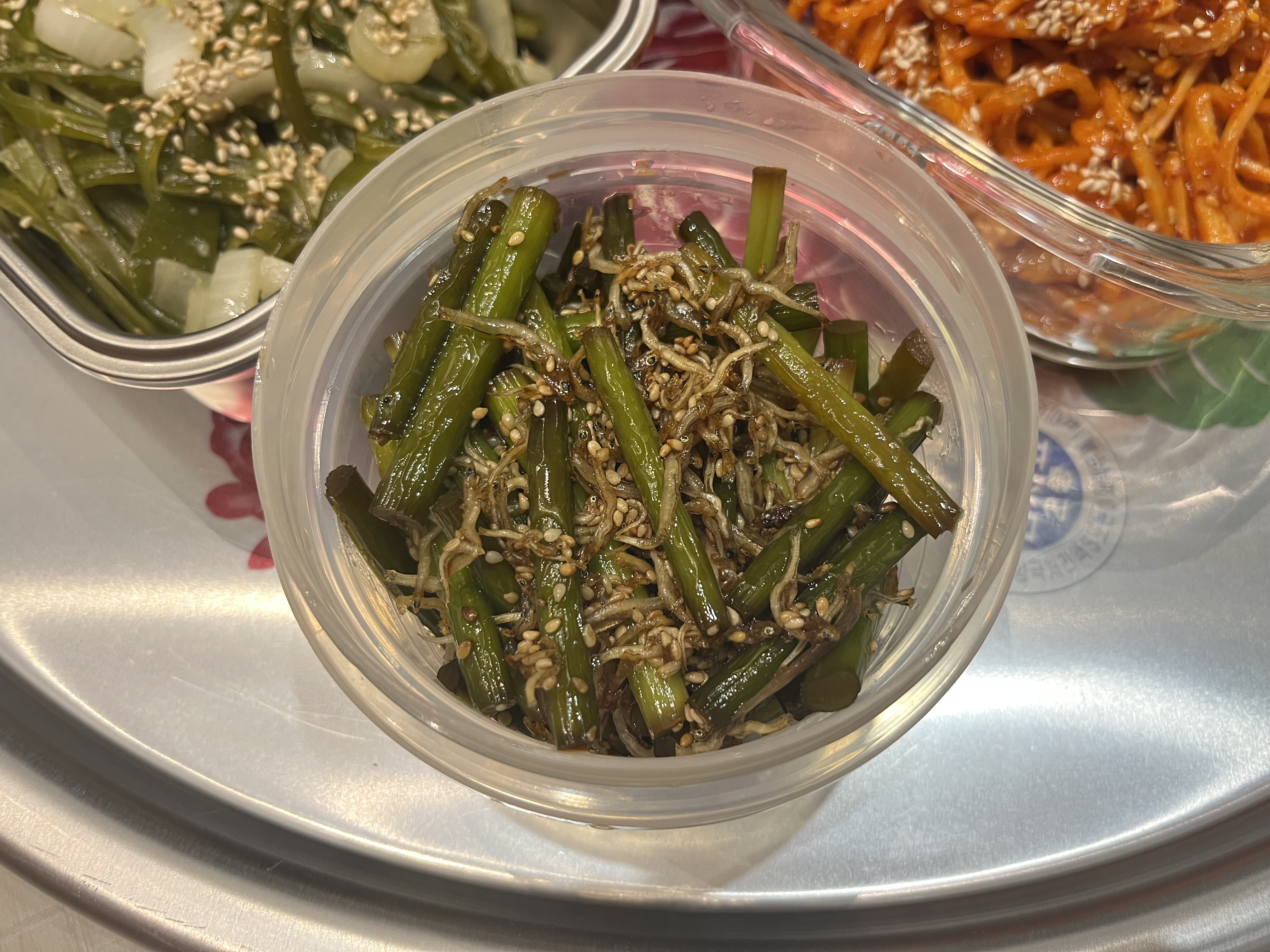 아삭한 마늘쫑과 짭조름한 멸치를 함께 볶아준다.