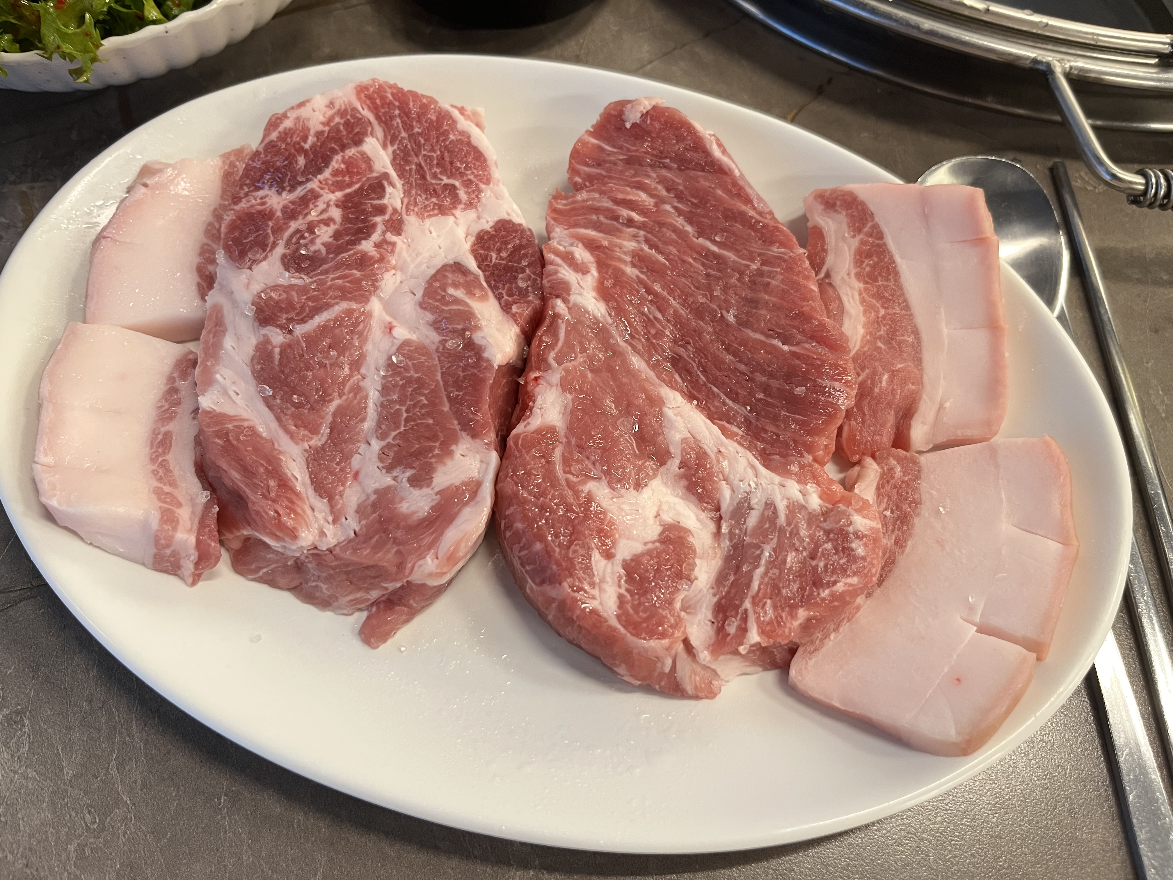 올리자마자 지글지글 소리와 함께 맛있는 고기 냄새가 솔솔 퍼지기 시작한다.