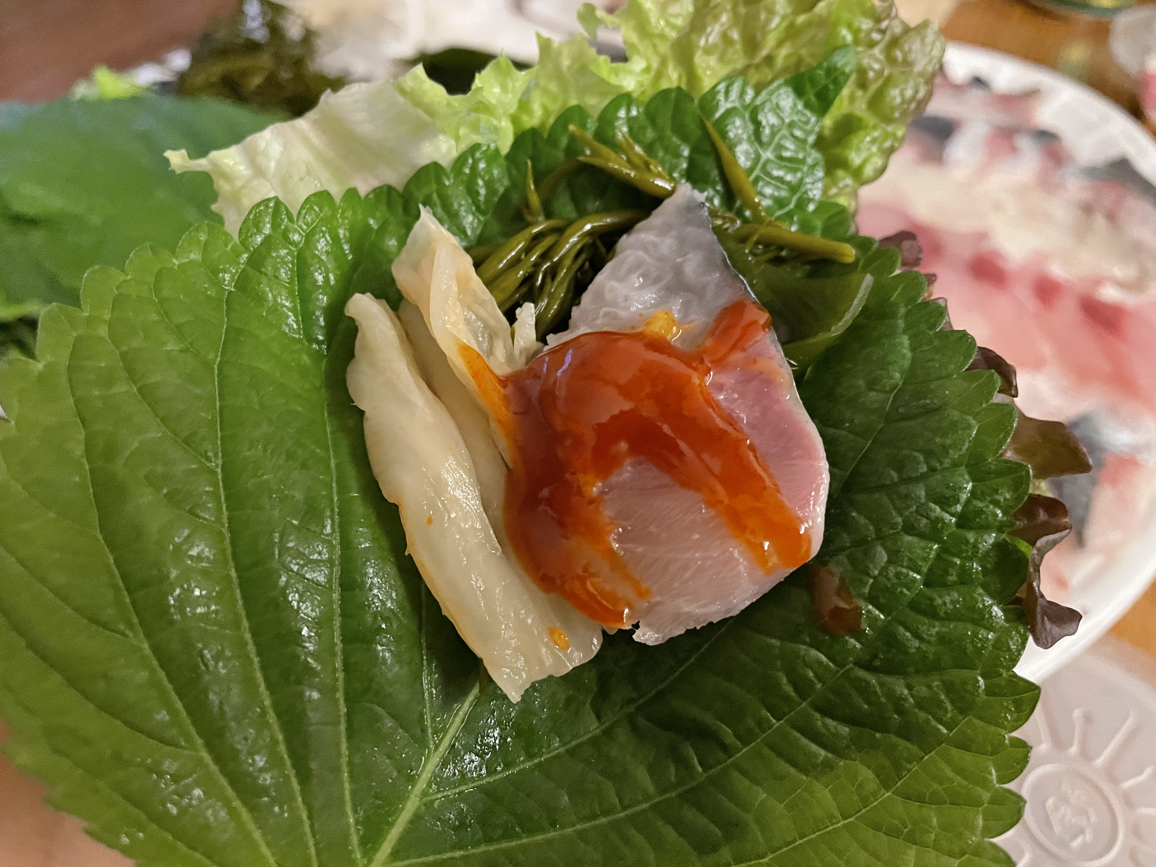 맛있는 생선회와 싱싱한 야채, 소스, 김이랑 밥도 있다.