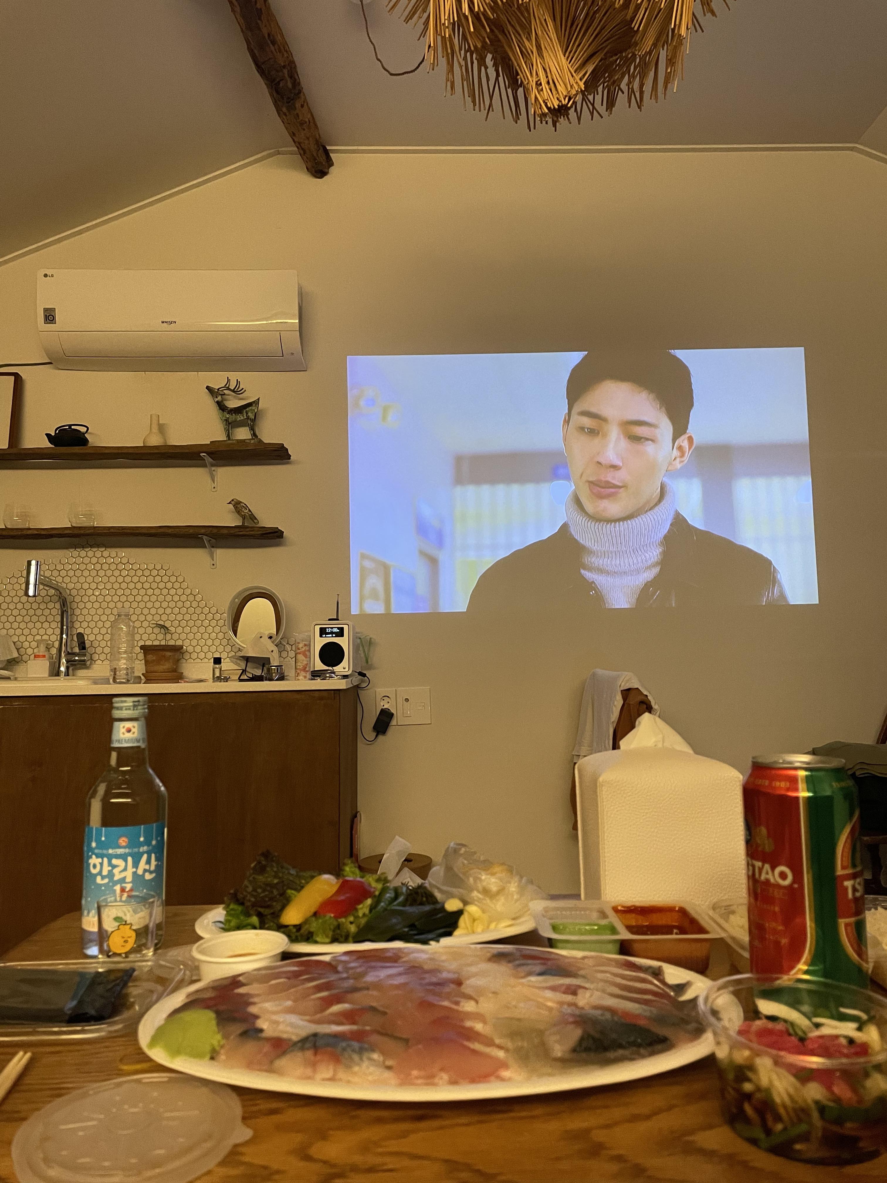 프로젝터로 드라마를 보며 앉아 맛있는 회로 우리 저녁을 함께했다.