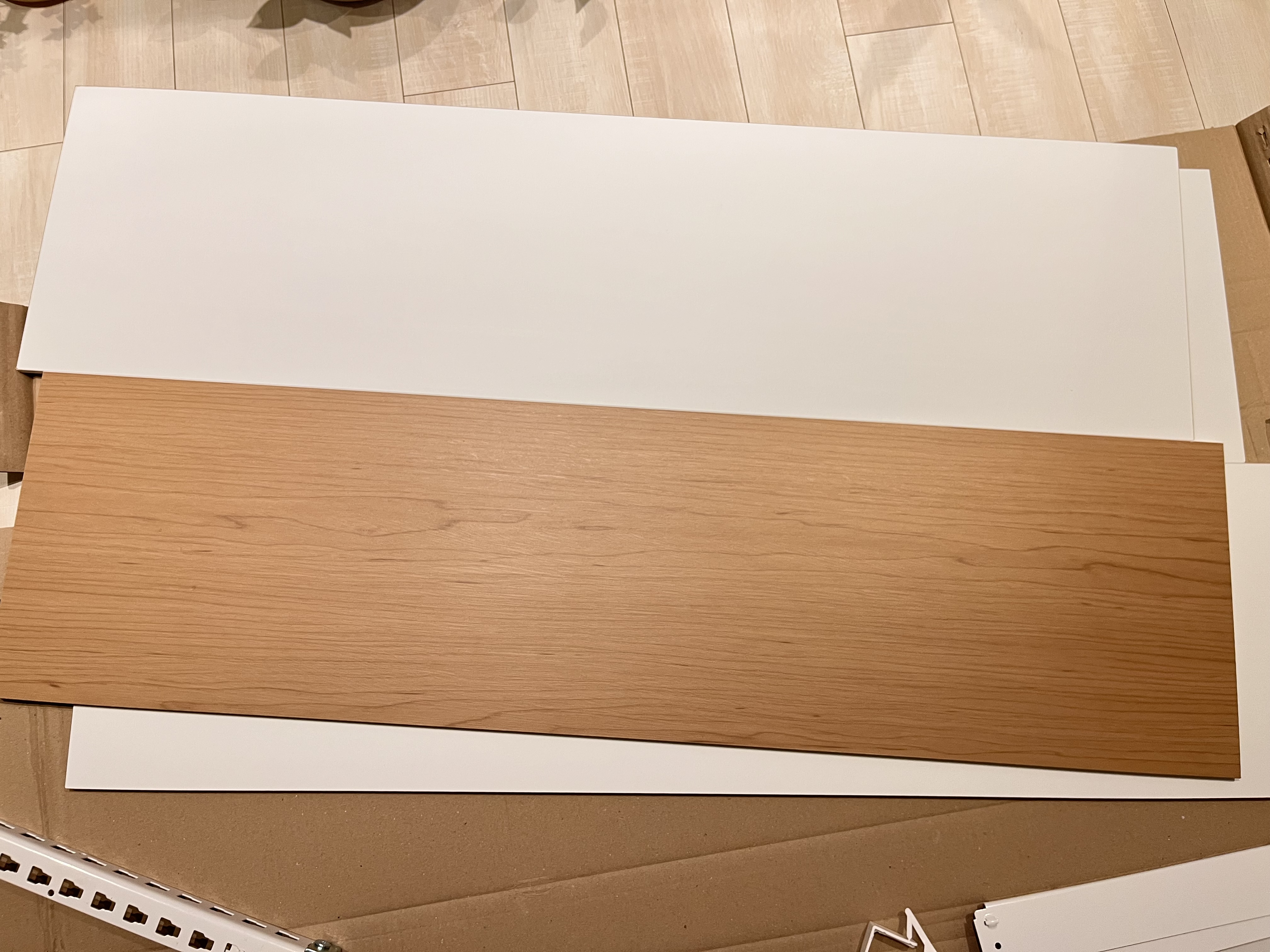 선반 보드는 한쪽엔 흰색, 한쪽엔 나무무늬로 양면 사용이 가능하다.