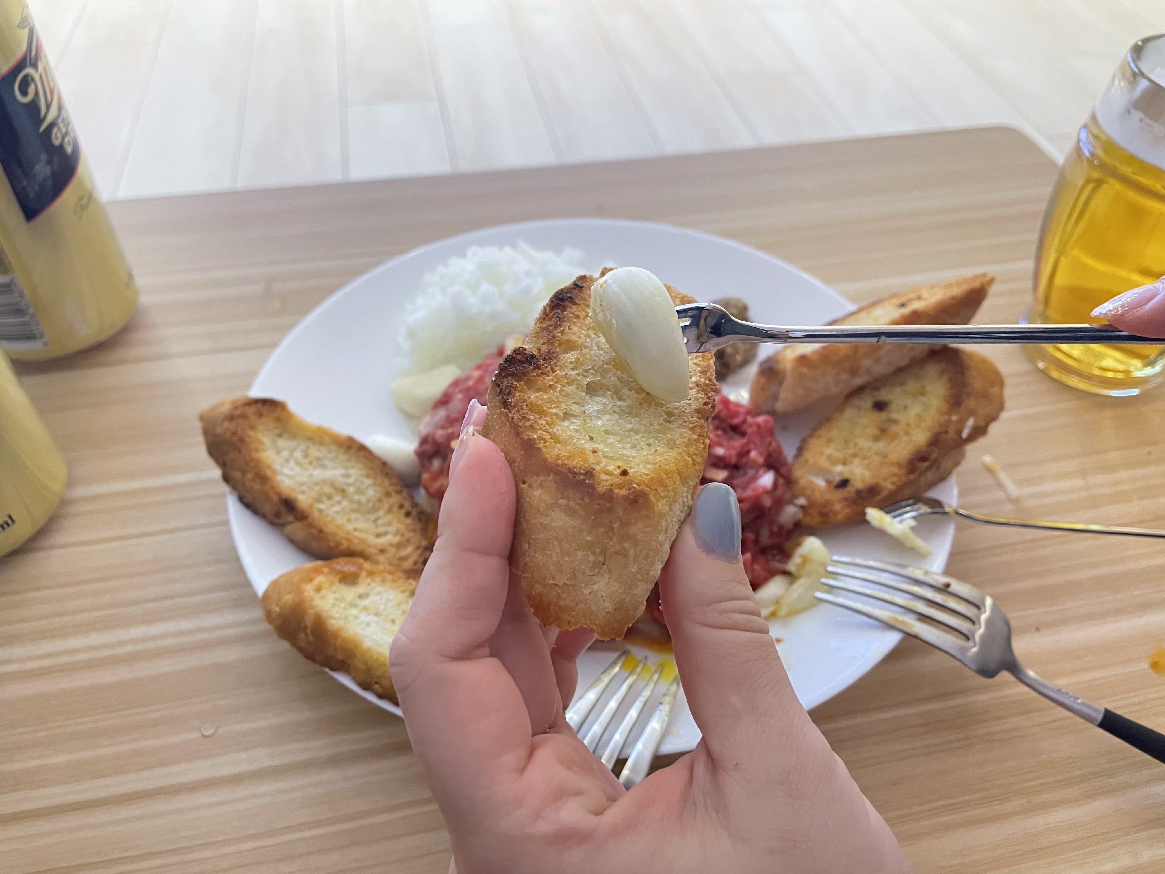 우선 바삭한 빵에 마늘을 바른다.