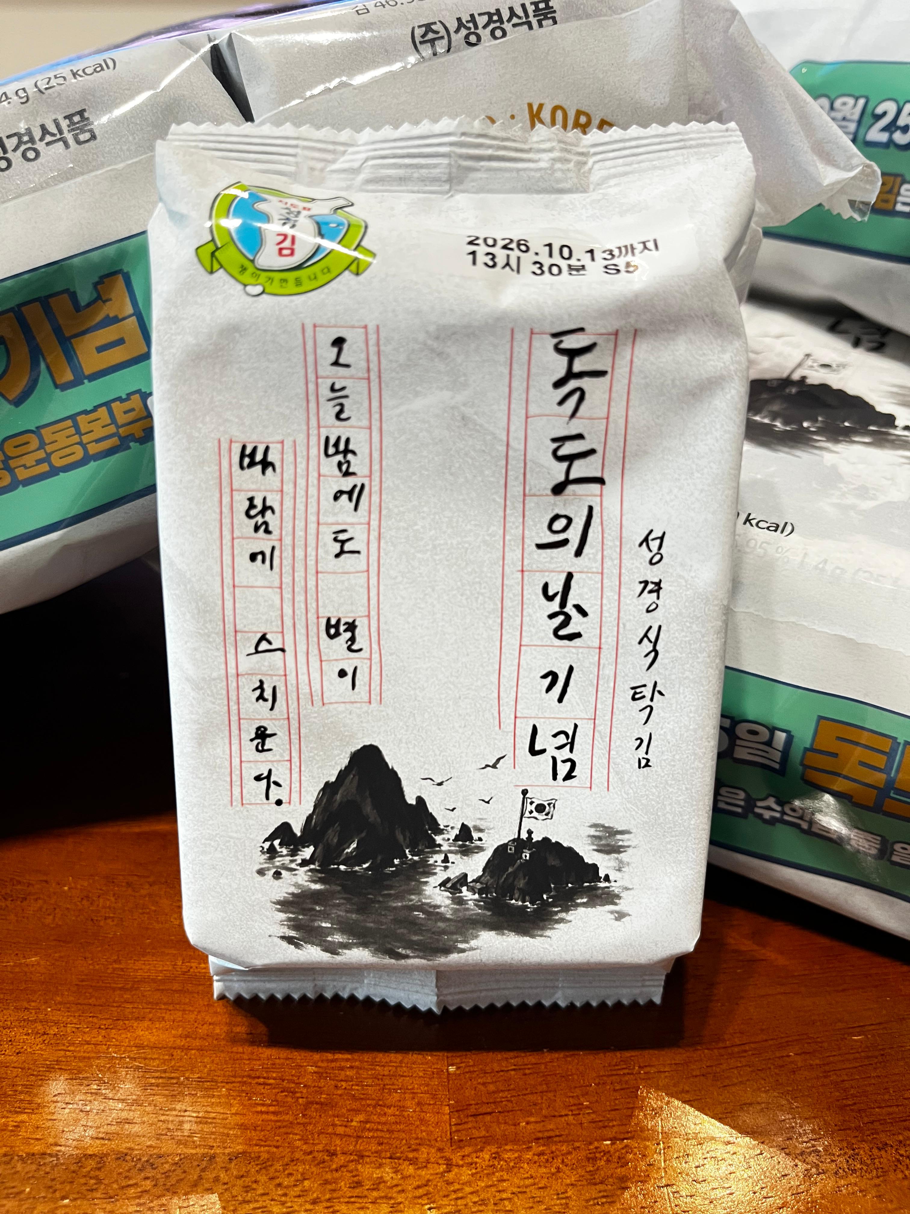 우리는 김을 참 좋아한다.집에서 밥 먹으면 도시락김 3~4개는 기본으로 먹는다.그중에 성경김을 주로 사서 먹는다.포장에 있는 우리나라 지도에 독도가 그려져 있고,독도 표기를 수정하고 수출