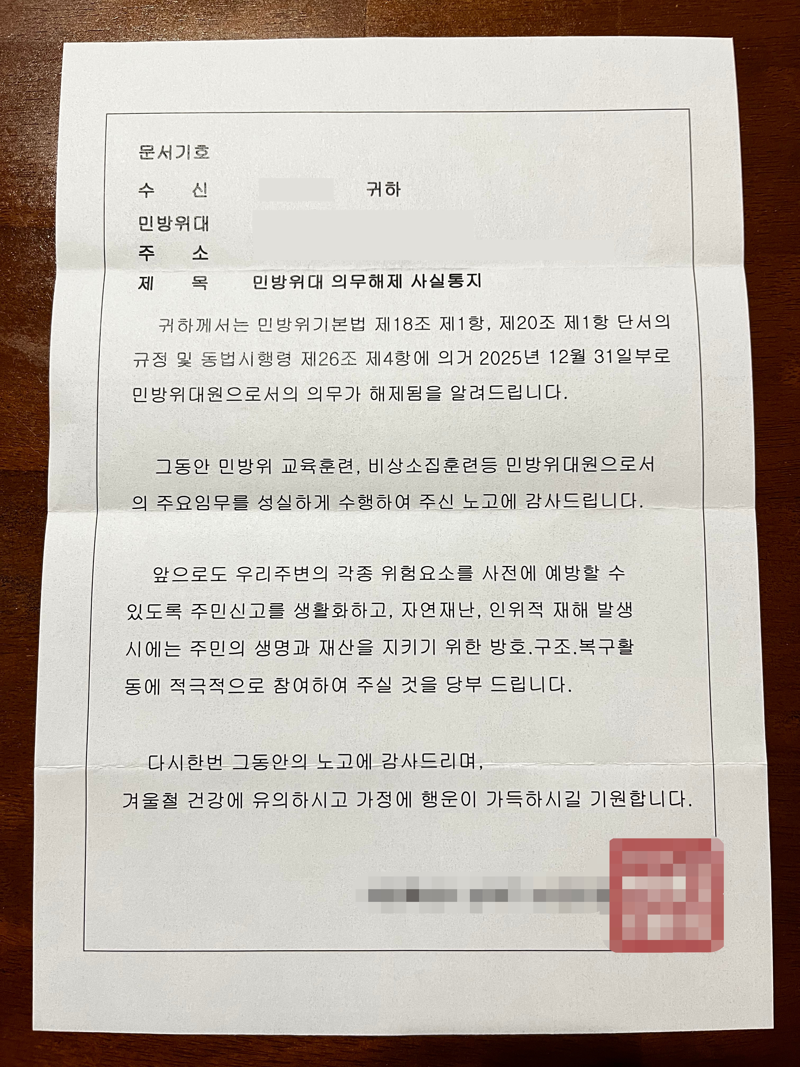 민방위대 의무해제 사실통지.