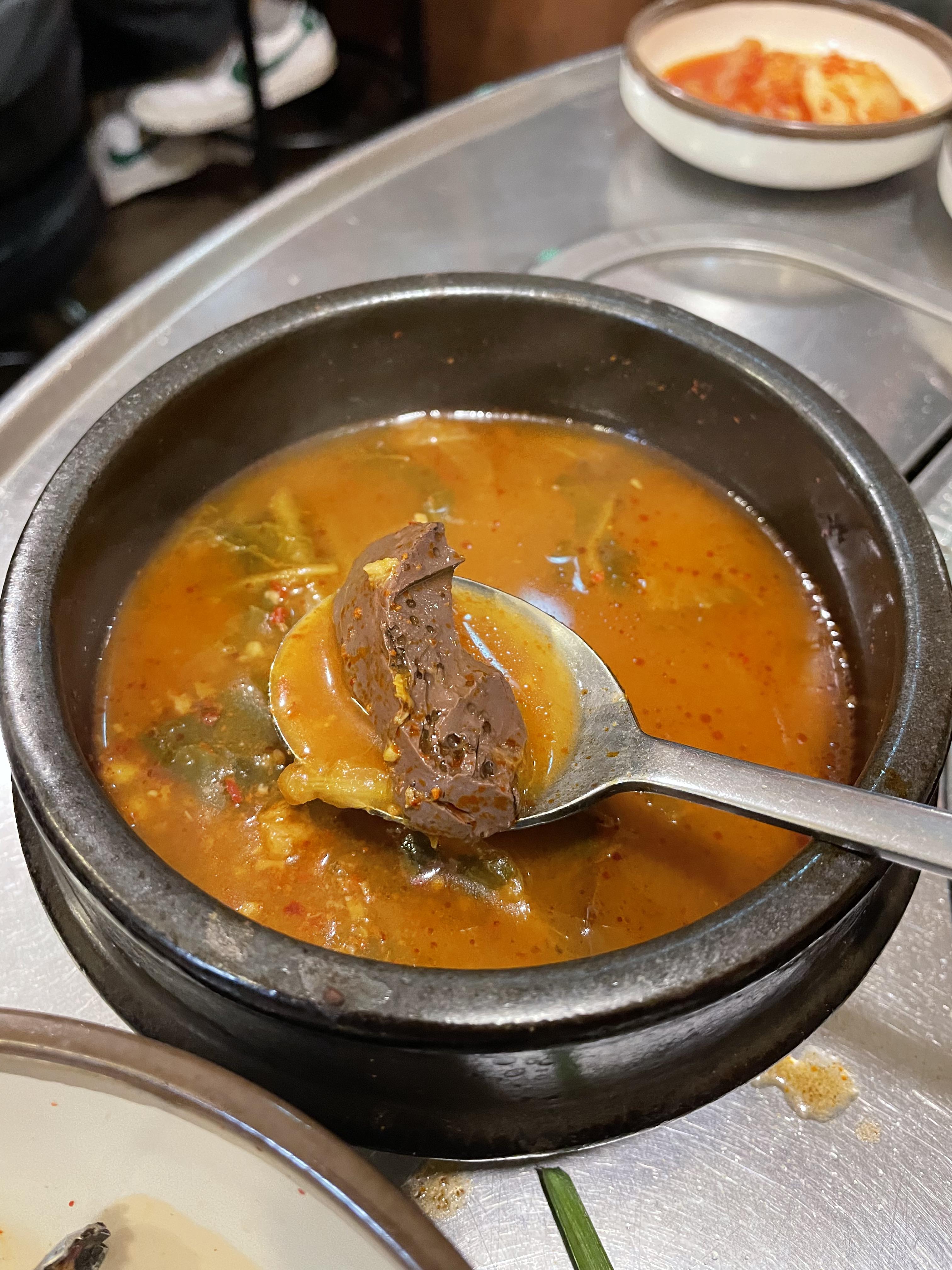 보글보글 끓는 뚝배기에 고소한 선지가 진짜 듬뿍 들어있다.