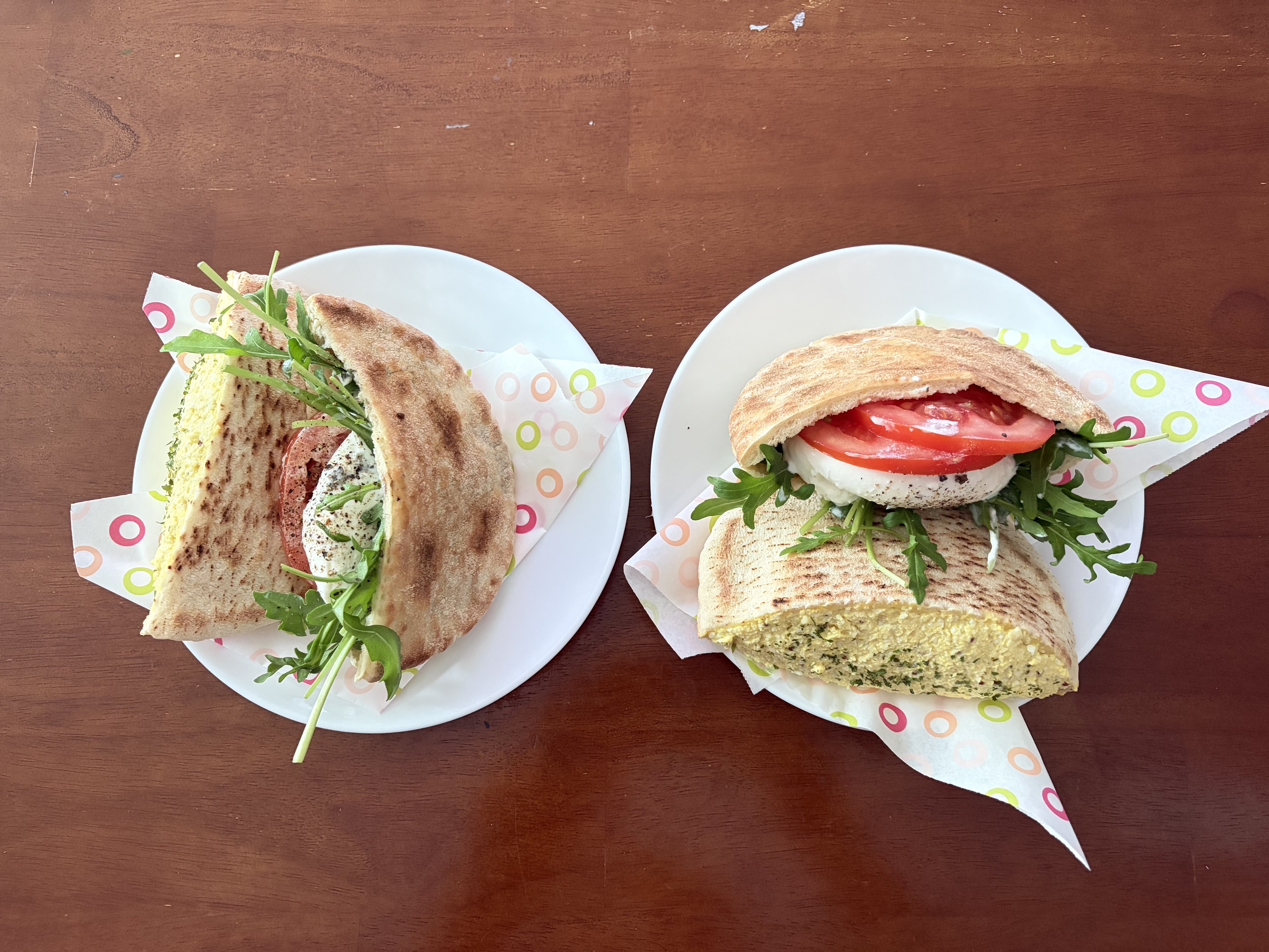 한쪽은 신선한 토마토 슬라이스와 루꼴라, 브라타 치즈로 만든 샌드위치.